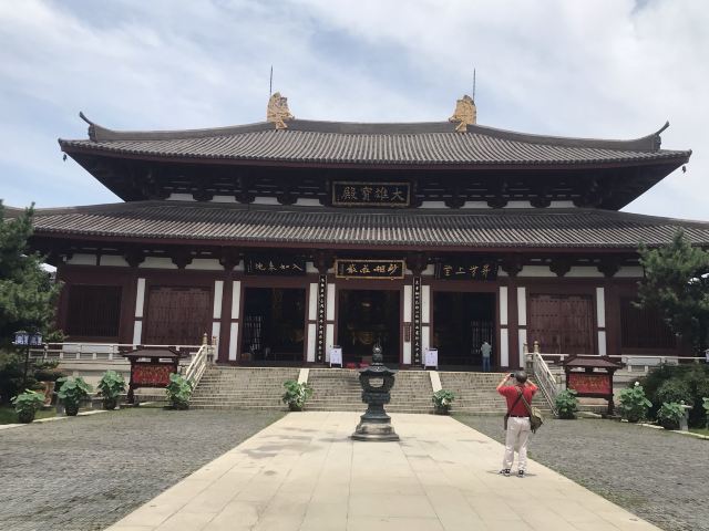 整座寺院以钢筋、水泥混凝土仿木所建,殿堂气宇恢宏、简洁自然。在寺庙中轴线上布置主要殿堂:山门、观音殿、大雄宝殿和藏经楼,左右对称布置伽蓝殿、大势至殿、钟楼、鼓楼、文殊殿、普贤殿、上客堂、僧寮等,并有迥廊围绕。此外,在地下建有功德堂、万佛堂。