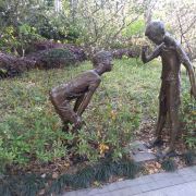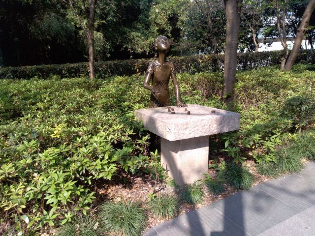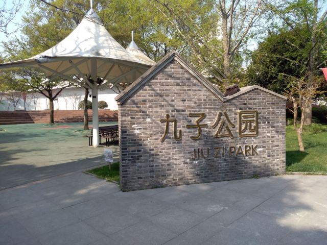 九子公园位于苏州河畔,园内设置了二十世纪五、六十年带上海老式弄堂民间传统九子健身游戏项目,掼结子、抽陀子、跳筋子、滚轮子、打弹子、套圈子、顶核子、扯铃子、造房子等9种民俗游戏,均以铸铜、花岗岩、彩钢板、彩钢管材料制作的雕塑体现,有2.5米高。在公园外墙还悬挂9幅不锈钢丝网画《弄堂里的记忆》,栩栩如生地记录了上海的地缘文化风情。