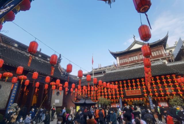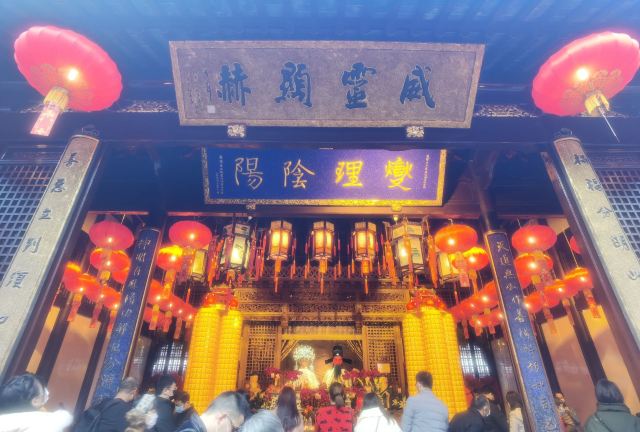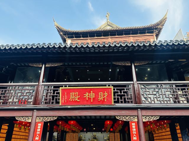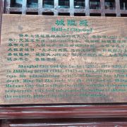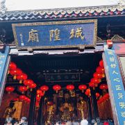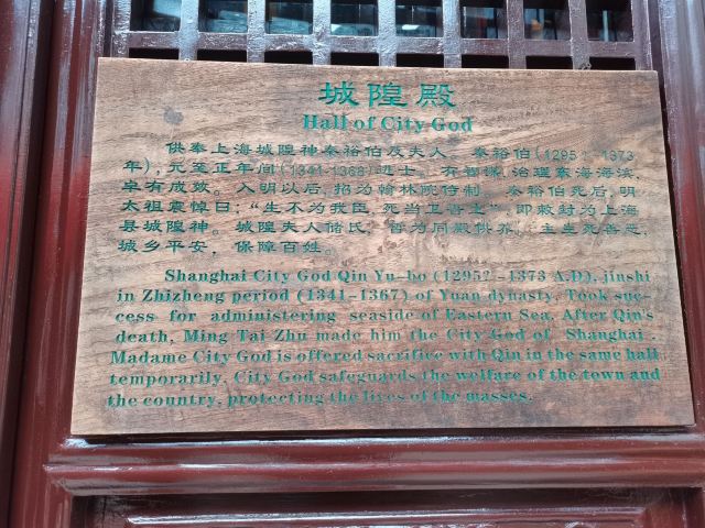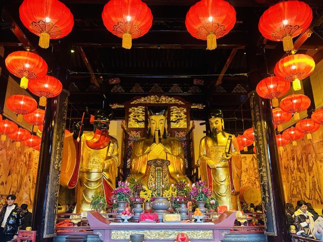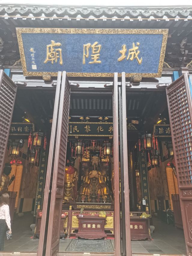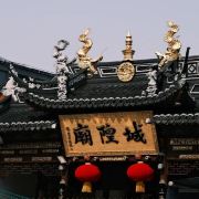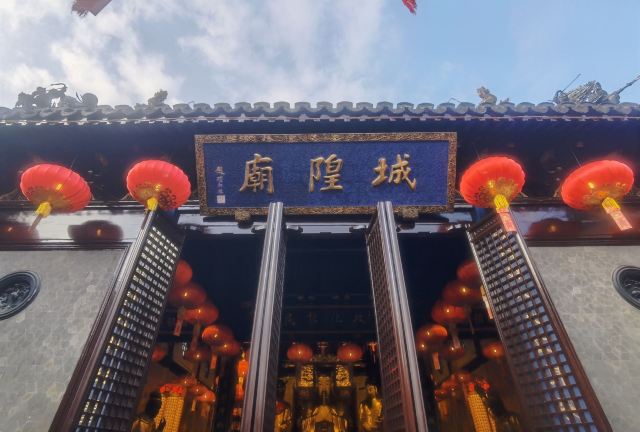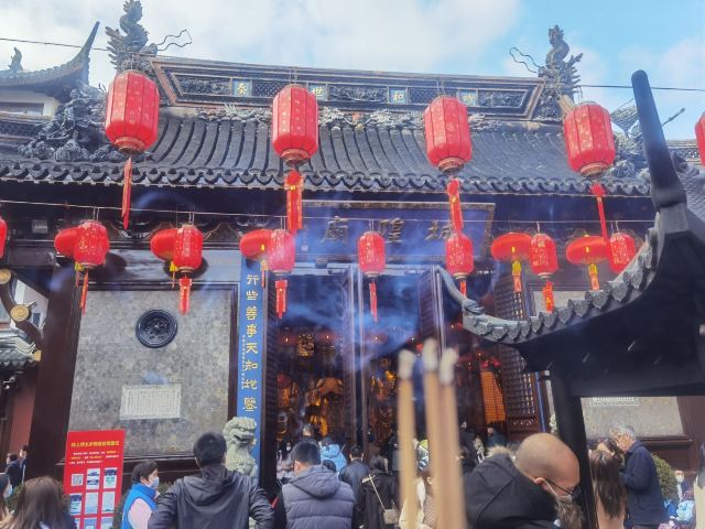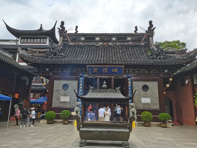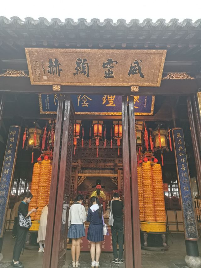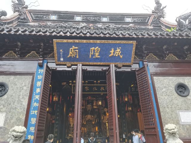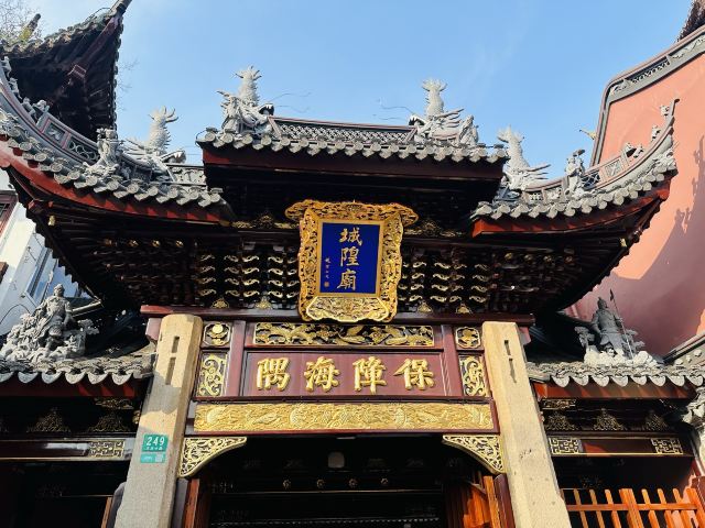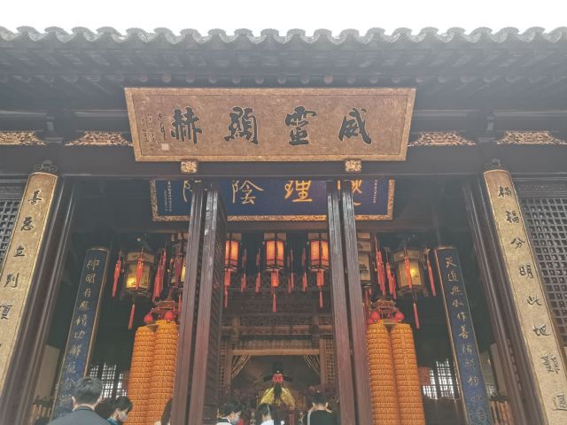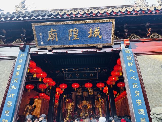 上海城隍庙始建于明代永乐年间(1403-1424年),比豫园还早一些,但在“文革”时期遭到严重破坏,后经修复重新恢复了全貌。观内现有大殿、甲子殿、财神殿、慈航殿、城隍殿等九个殿堂。大殿正门上悬“城隍庙”匾额,内供奉金山神主——汉代博陆侯霍光大将军坐像,左首为文判官,右首为武判官,次为日巡与夜查,日巡、夜查以下为八皂隶。