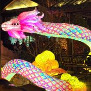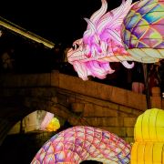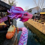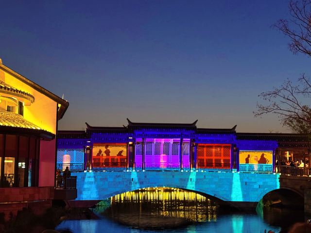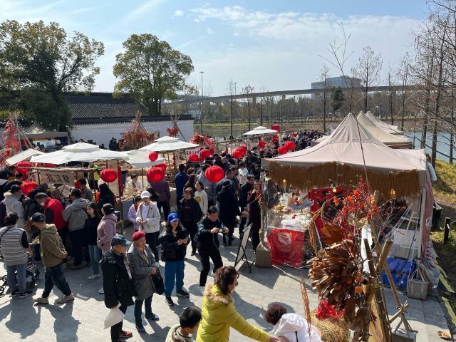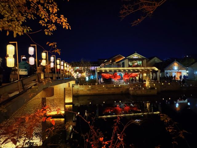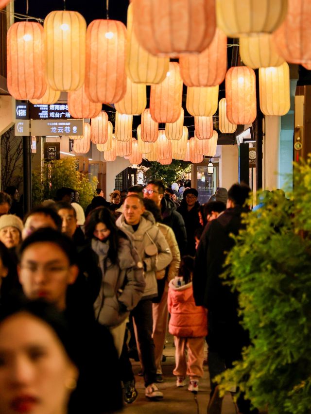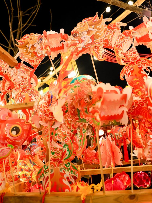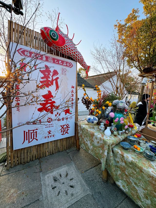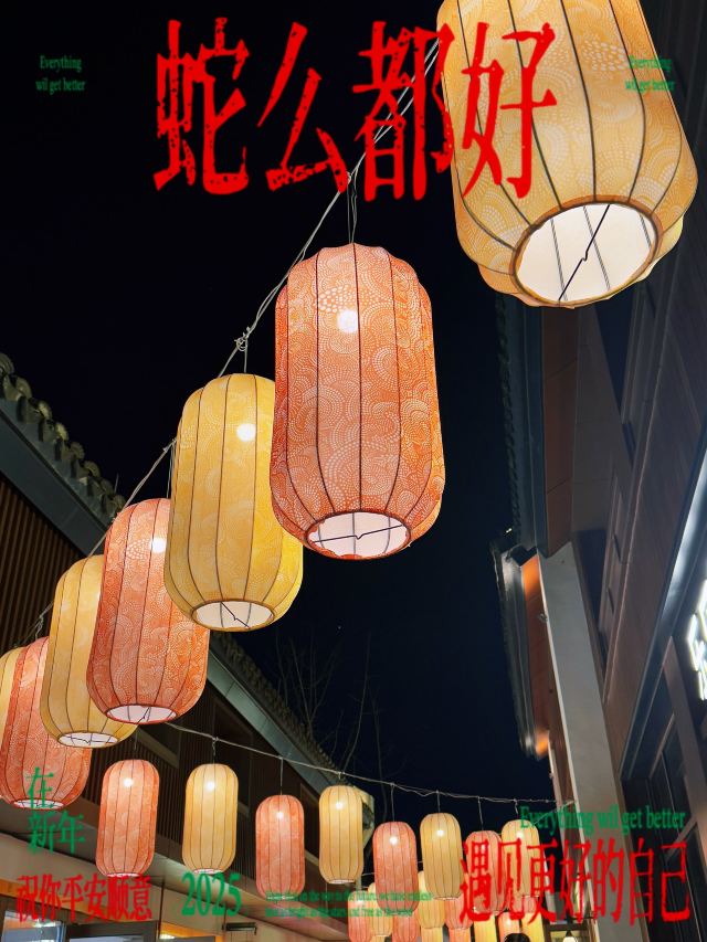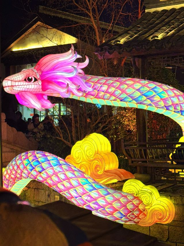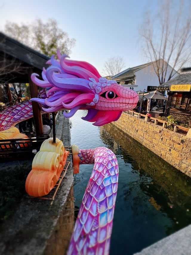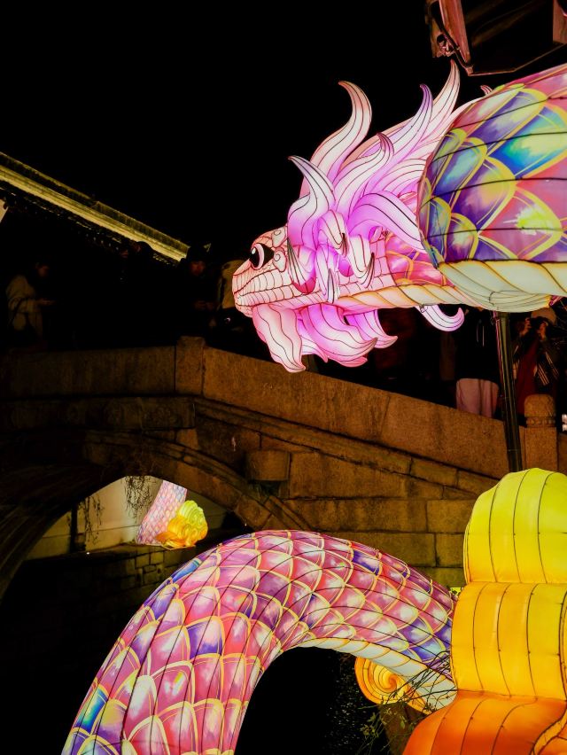 出片:这里千年古桥香花桥上环绕了一条巨型灵蛇是国家级非遗传承人手工制作的彩灯,涵春桥畔水榭间,手工打造的红色鲤鱼花灯,活灵活现,十分吸睛。在摩肩擦踵的人群中感受充满民俗氛围的“蟠龙水集•乙已庙会”,除了各种特色年味小摊、年宵花灯,还有丰富的互动体验项目,如亲手编织红绳、剪窗花等,逛庙会!赏花灯!小时候的年味回来了!逛逛庙会各种手工艺品琳琅满目,让人目不暇接看到喜欢的小物件买了就是。夜晚华灯初上,先在戏台看一场非遗皮影戏,接着烟雨廊桥创意灯光秀开始上演,光影秀以“蟠龙新十景”为创作灵感,点亮夜色与水成映。跟着行人走走停停,举目四望,蟠龙的石桥及街巷间,以现代的“蛇影”呈现江南的暖意与年味,千盏巳物蛇影灯重现江南灯会盛景,漫步于此感受极致中式浪漫~