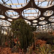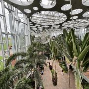 上海温室花园有4个场馆,由空中连廊、工业桁架相互连接成一个整体,其中4个场馆是游服中心1个,主题场馆3个。3个主题场馆分别是海市沙洲(1号馆)、云上森林(2号馆)、云雾峡谷(3号馆)。3大主题场馆空间以变异的叶、会呼吸的根和空中的花为故事线,分别展示热带干旱植物、热带雨林植物与热带花卉植物。同时,展示形式上力求表现植物到博物+文化的延展,从而打造好看、好玩的沉浸式展览温室。