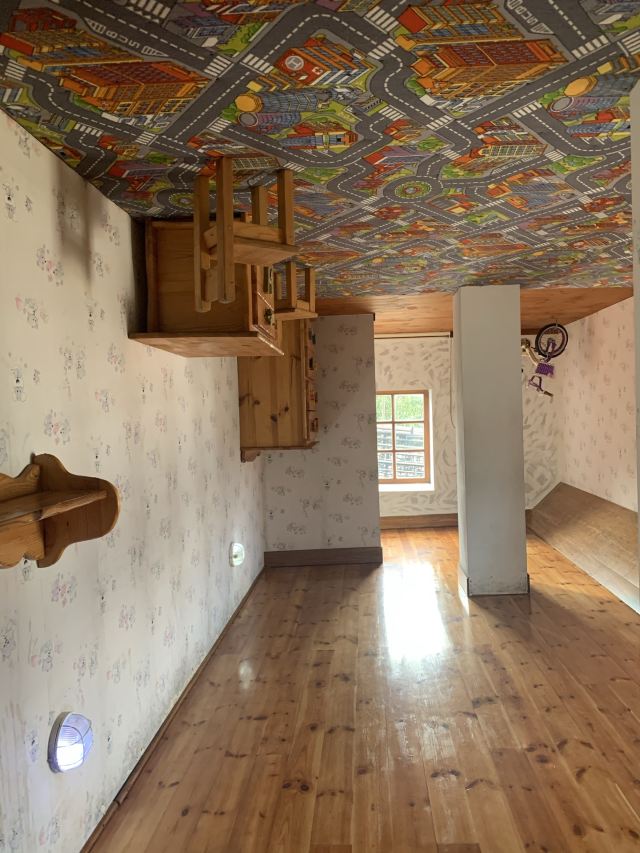 😇这里面的一切设施比如:床铺、柜子、桌椅、洗脸盆、抽水马桶等都是倒挂在头顶,就连地毯都成了天花板了。不但是“大头冲下”,而且还是倾斜的:半边屋顶倒戳在土中,另半边却晃晃荡荡悬在近两米高的空中。屋里的一切也都是颠倒的:顶灯被踩在脚下,而大衣柜却惊险地在脑袋顶上高挂着。如果想“登上”二楼,就得忍住头晕,顺着旋转扶梯,一点点摸索着蹭下去,几乎每个人都被屋里颠倒的天地搞得头晕眼花。但是发现,我们大人晕眩的站不直腿,但是小孩玩的很开心!