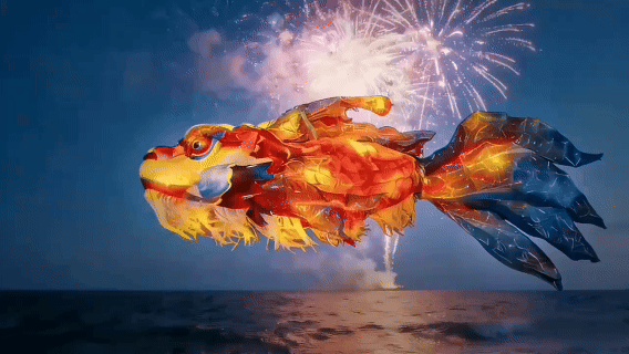 烟花点亮夜空之际,非遗飞天鳌鱼将从海面腾空而起,配合烟花凌空摆动。这是传统彩灯与现代烟花的完美融合,更是你从未见过的海上视觉奇观。