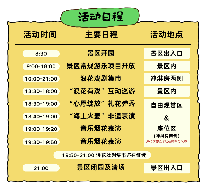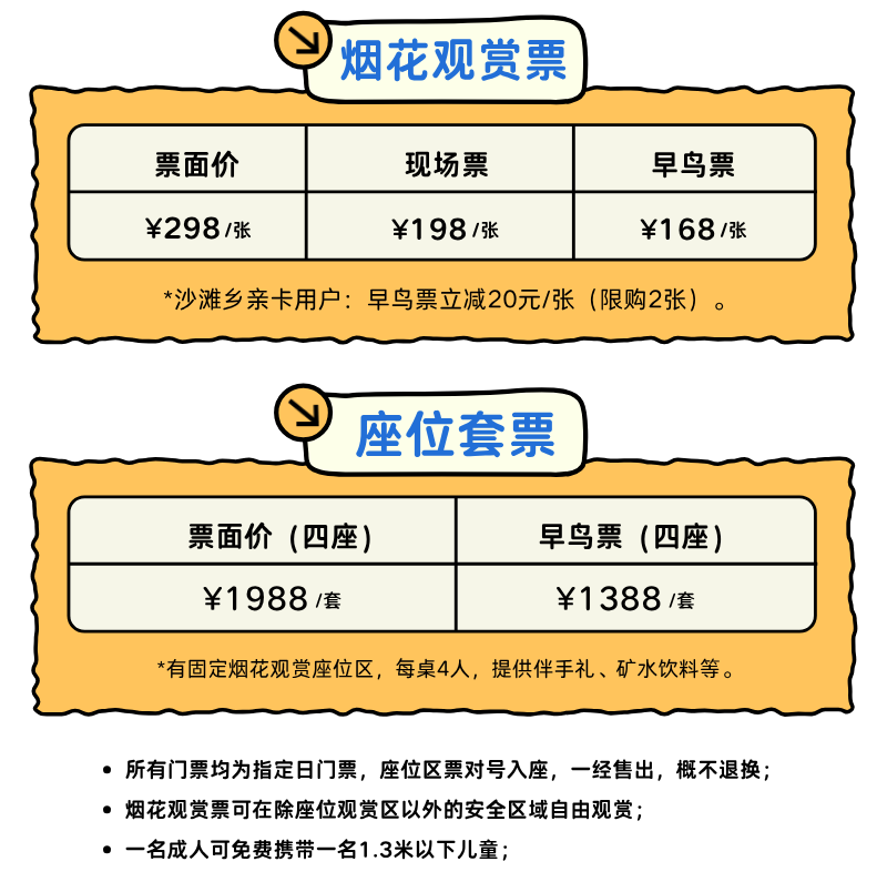 ·游客凭当日沙滩烟花秀门票进入沙滩景区,当天不售卖景区门票。