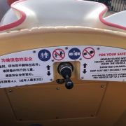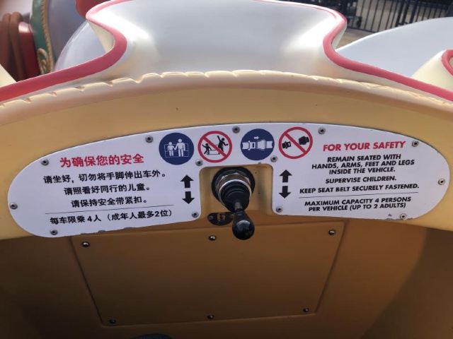在排队的时候,工作人员会给每位游客发一个牌子,等坐在小飞象上,会把牌子回收,乘坐的时间是比较短的,大概也就1分钟时间,前面有个上下控制摇杆可以控制小飞象上下,在最高的地方看城堡景色挺不错的。