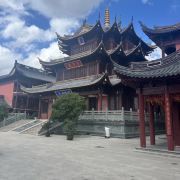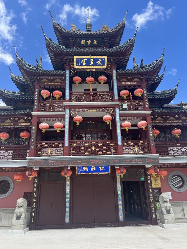 文昌宫(古社庄庙) 主要建筑分为前后两大部分,前部分主要供奉文昌帝君,两边厢则分别立有六十甲子神等塑像。后面部分设有玉皇殿,玉皇殿高三层,雕梁画栋,有着非常精美的彩绘,上海道教学院也设在此地。