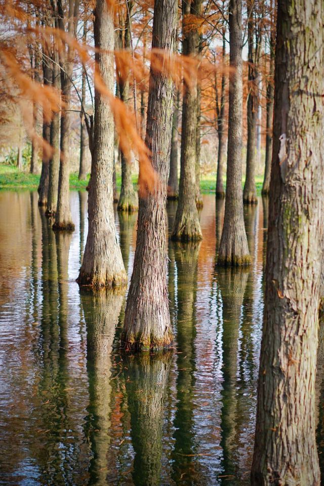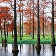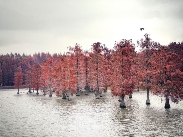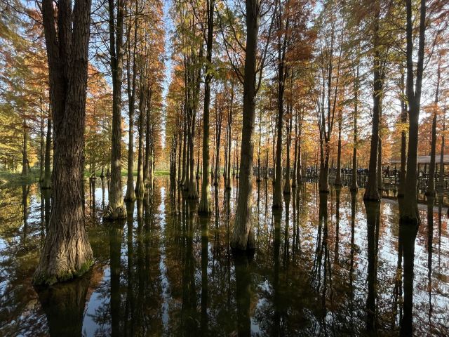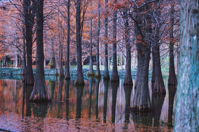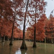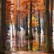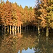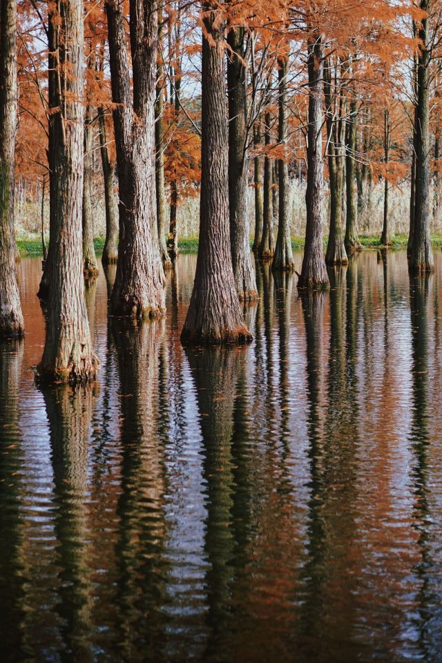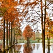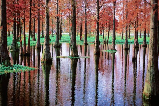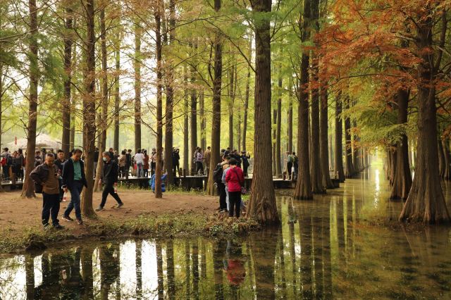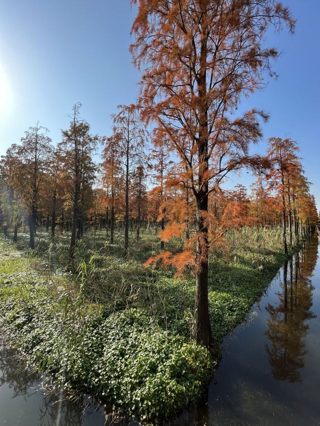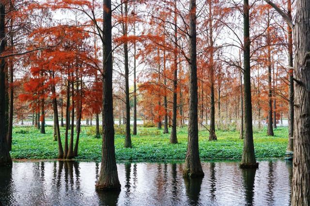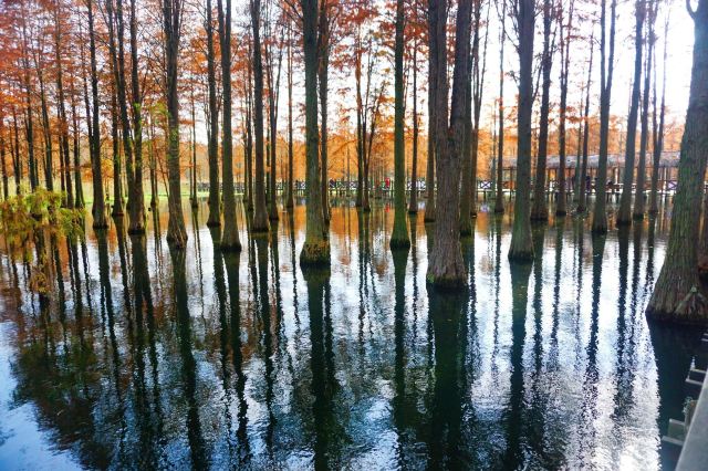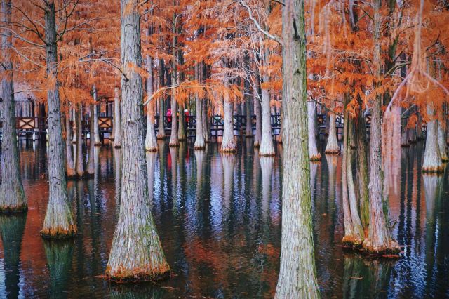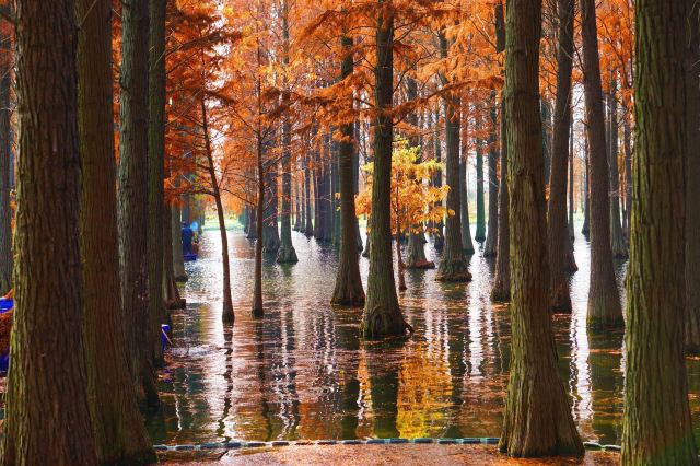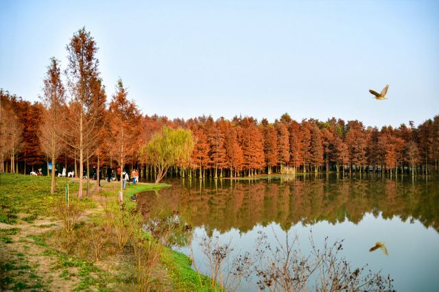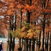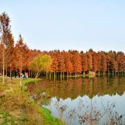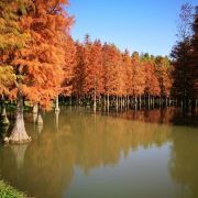 每到深秋初冬时节,水杉树原本翠绿色的叶片转为赭红色,一大片水杉矗立水中,,水面如镜,倒映着树笔直的身躯。十分壮观, 他也是 上海 唯一的“水上森林”。