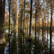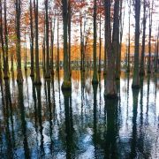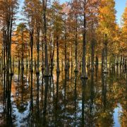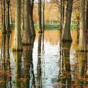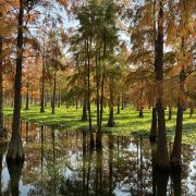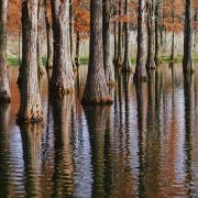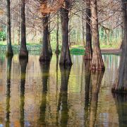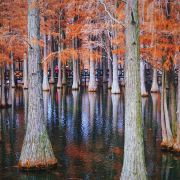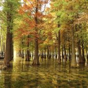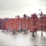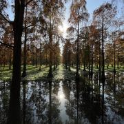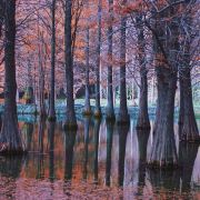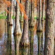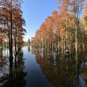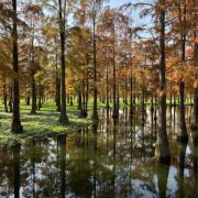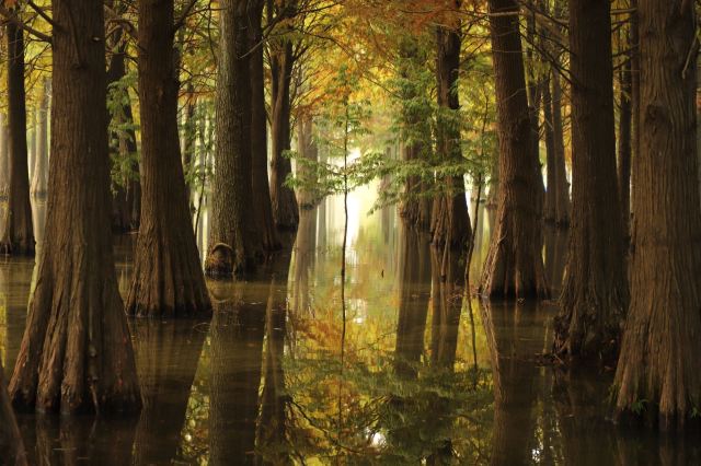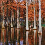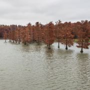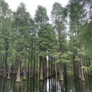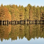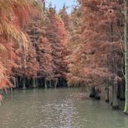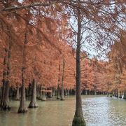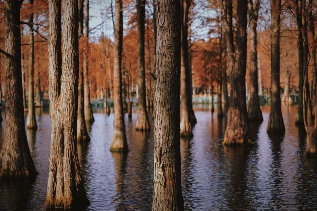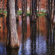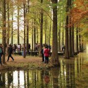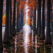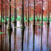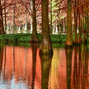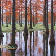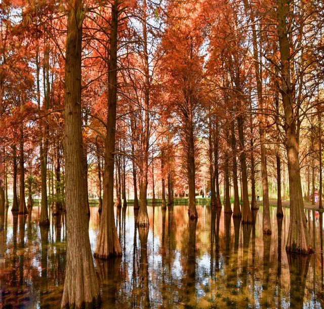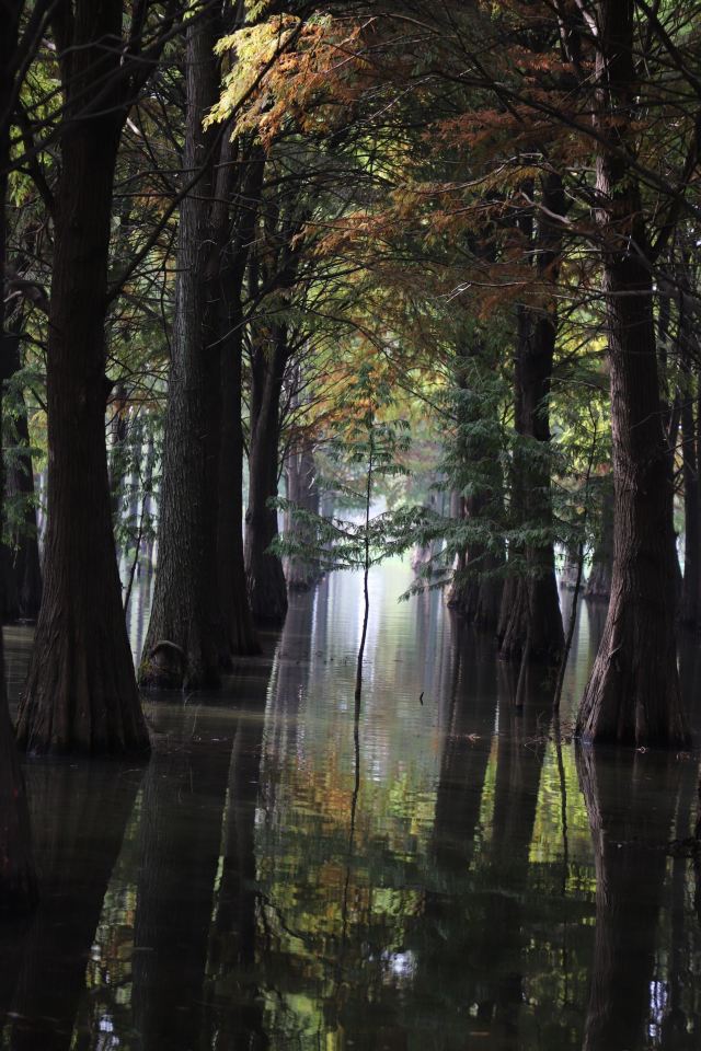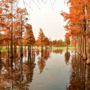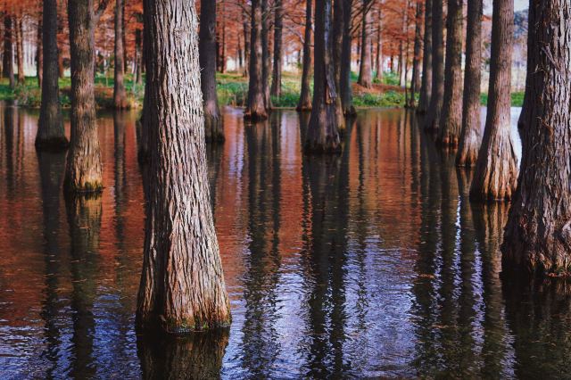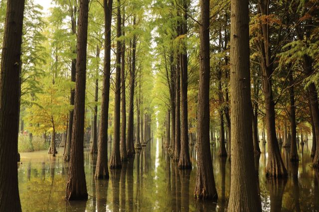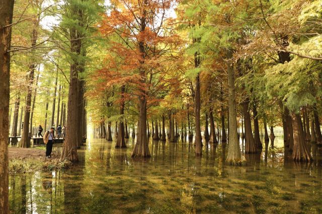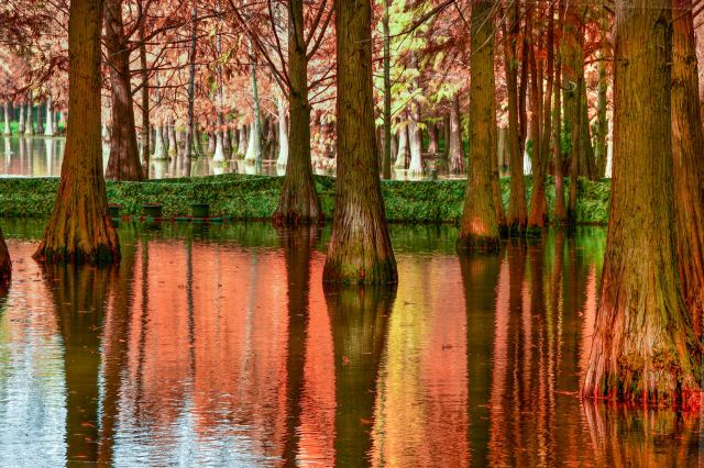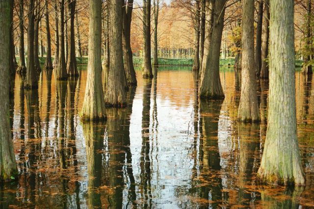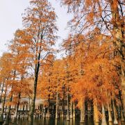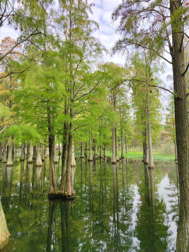 每到深秋初冬时节,水杉树原本翠绿色的叶片转为赭红色,一大片水杉矗立水中,,水面如镜,倒映着树笔直的身躯。十分壮观, 他也是 上海 唯一的“水上森林”。