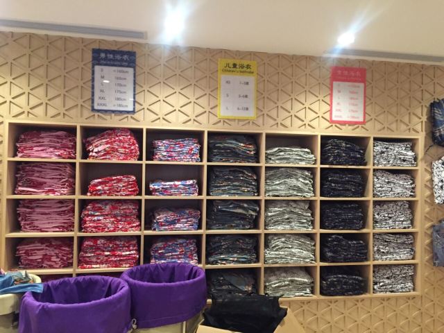 涟泉大江户莘庄店一共有三楼,面积非常大,一楼区域为泡汤区、鱼疗区,以及一些商品店,进入场馆后,可以先领一套泡温泉的服装,如果觉得服装款式太过于简单,也可以租和服的,这里的和服款式很多。泡汤的区域环境挺一般的,泡汤池的数量不是很多,室外有一个独立的泡汤池,不过规模,大概也就泡泡脚吧。