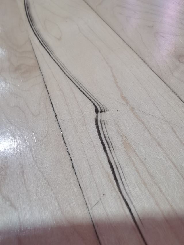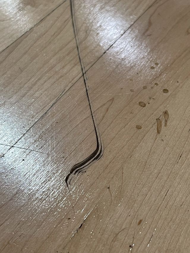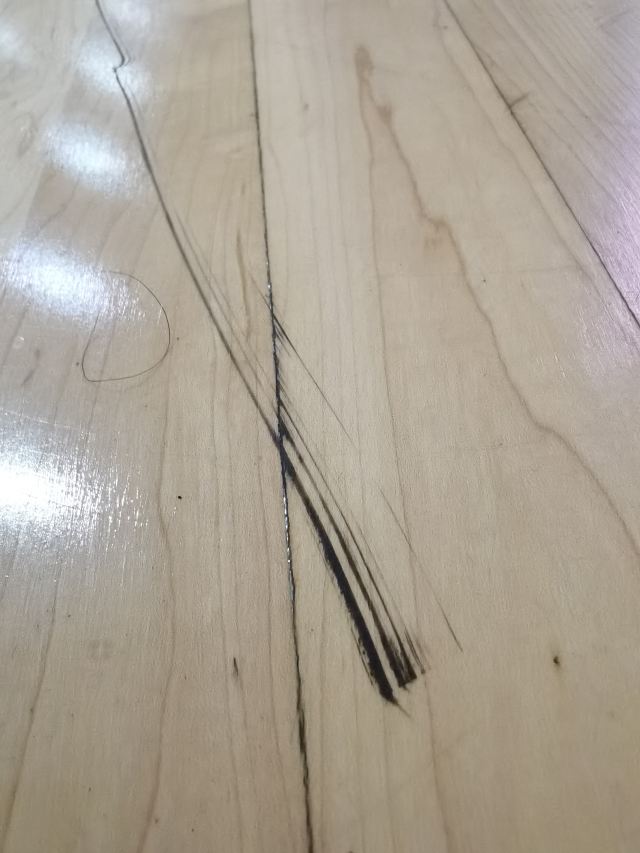 第二:我现场触摸了划痕有凹凸感,绝对有可能是尖锐物品剐蹭拖拽造成,而且已经很长时间了,日积月累的灰尘污渍导致痕迹变成了黑色,这样的痕迹球场四周到处都是。