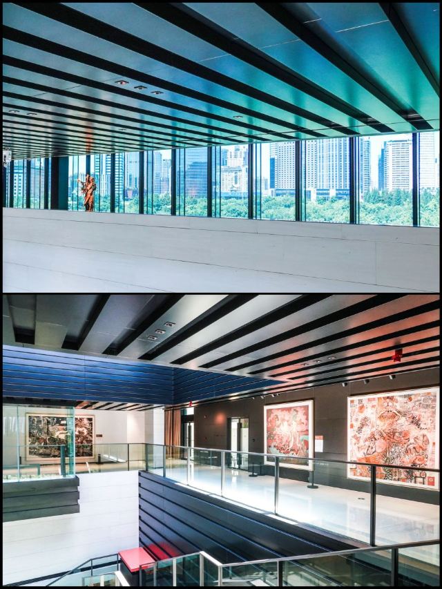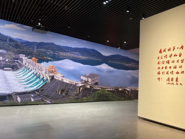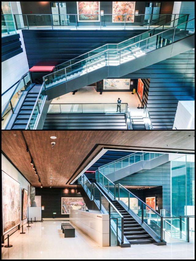5分 超棒美术馆设计颇为现代,石材/玻璃叠加,错落有致,傍晚闭馆前一小时赶到匆匆浏览。一楼新安江主题展-“敢叫日月换新天”豪气冲天,这是我国首座自主设计建造的水电站,感慨于建设者自力更生,艰苦奋斗的精神。第一展厅出来,拾级而上,头顶天窗洒下自然光,空间明亮,视野开阔。