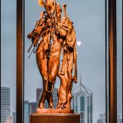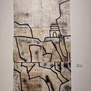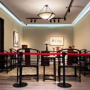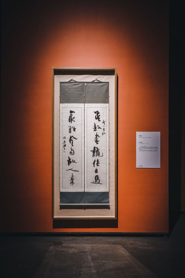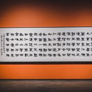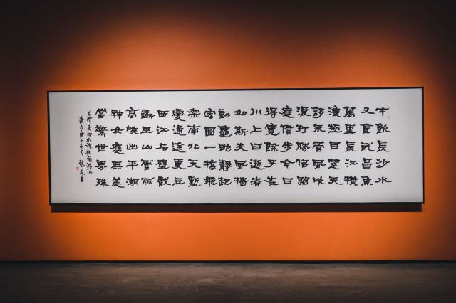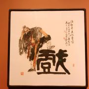 电梯直接下到一楼,隐蔽的出口边有个书吧,店门紧闭,只见有幅影印书法作品,笔力遒劲,抓人眼球 — “法古思变,创新能典” ,即刻呼应今日观展所得,于是微微一笑,迈出展馆。
