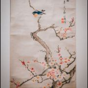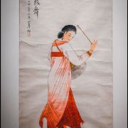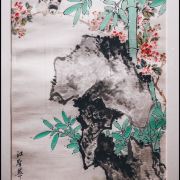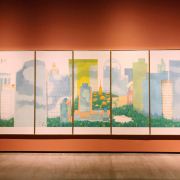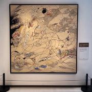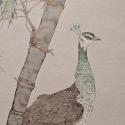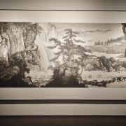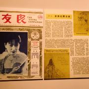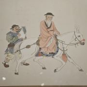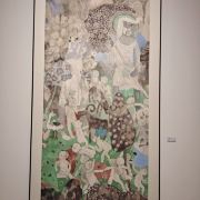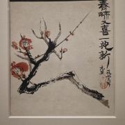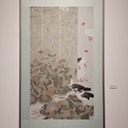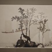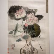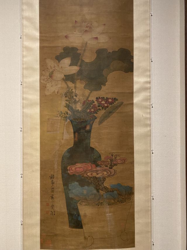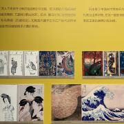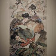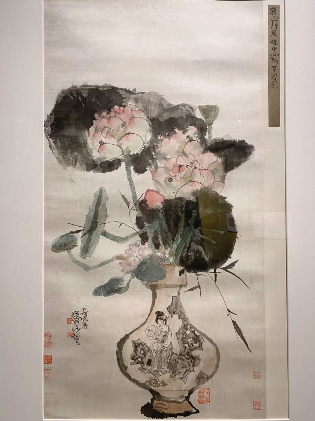 三楼有程十发代表作品展,细细看来得以了解这位当代中国画大师的生平。特展厅展出了程十发捐赠的藏品-陈洪绶书画,甚是喜爱瓶花图,荷花插瓶,清雅出尘。旁边一幅程老模仿其作,并别出心裁在瓶身上画一仕女,手持团扇,扇面亦是荷花,很可爱。转身看到一组对比图片,原来被当作东方艺术的代表的浮世绘最早的一道潜流正源自晚明的陈洪绶。不由驻足对照欣赏,啧啧赞叹。