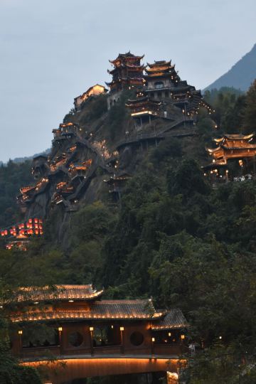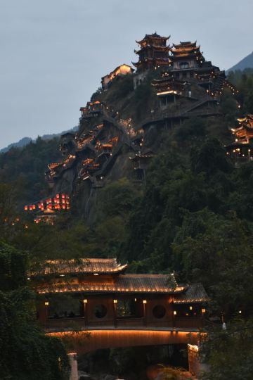 仙侠氛围:悬崖上的悬空玻璃客房、图书馆、餐厅等建筑错落有致,云雾缭绕时宛如仙侠剧场景,Z型栈道和揽月桥的夜景尤为梦幻23。