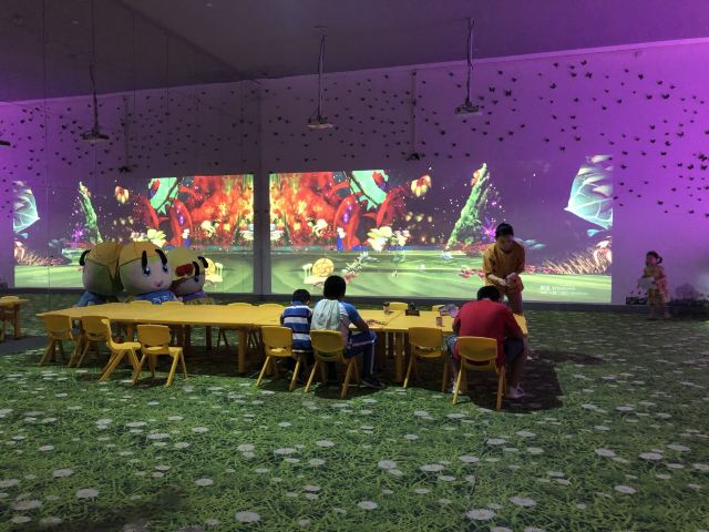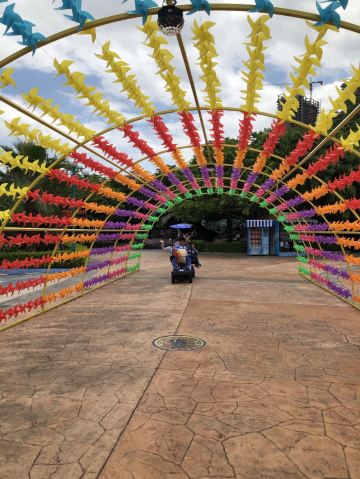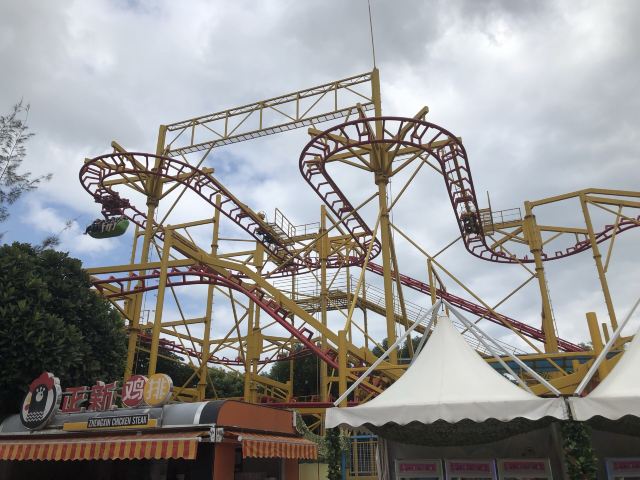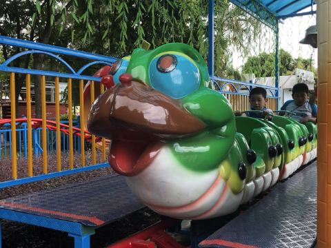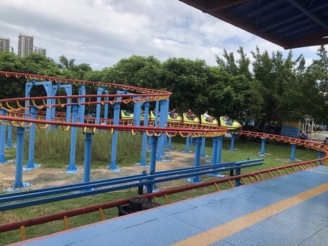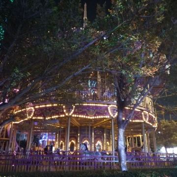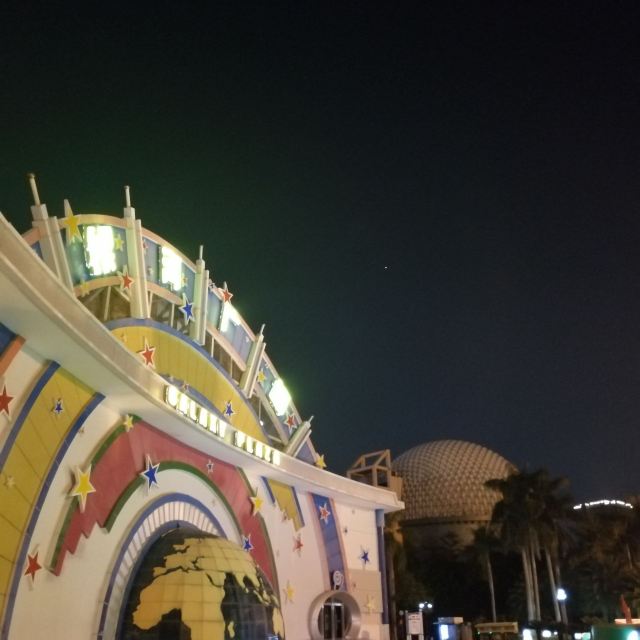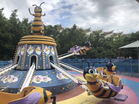儿童王国里面的所有项目晚上都开放随便玩——中高烈度的悬挂过山车(最后俯冲绝对是高潮),超眩晕的UFO摩托和空中飞舞(大摆锤),有点晕的旋风飞椅,中等强度的太空飞车(家庭过山车,我儿子坐了6次),这5个机动项目玩下来已经够HIGH了。