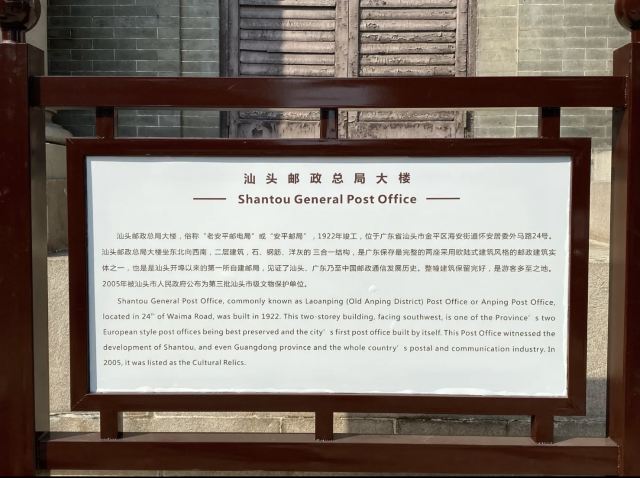 汕头邮政总局大楼俗称“老安平邮电局”或“安平邮局”,是汕头开埠以来的自建邮局,见证了汕头、广东乃至中国邮政通信发展历史。与广州邮政博物馆一起成为广东省邮政系统中保存较完整的两座采用欧陆式建筑风格的邮政建筑实体。属于市级文物保护单位。