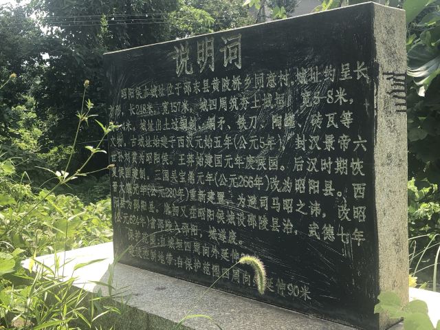 昭阳侯城,位于邵东县黄陂桥乡同意村(今大禾塘街道),长方形,东西宽250米,南北长350米,四周保存有夯土城墙,残长约100米,四角有城楼台基。曾出土青铜剑、铁刀、方格纹陶罐、砖、瓦等。 《汉书.王子侯表》载,西汉平帝元始五年,封长沙刺王子赏为昭阳侯,昭阳侯国属零陵郡。公元5年,西汉平帝析昭陵县(今邵阳市)东境置昭阳侯国,封长沙王刘刺之子刘赏为侯。侯国设城于今邵东县黄陂桥乡同意村。公元8年,因王莽篡汉而侯国除。