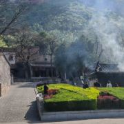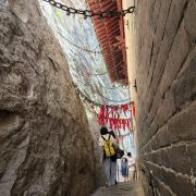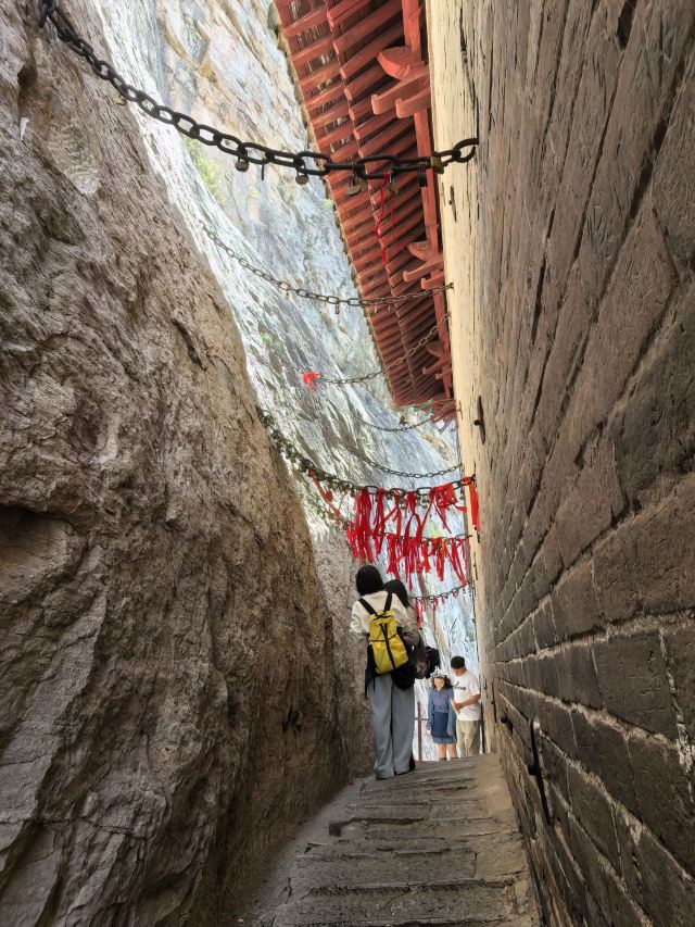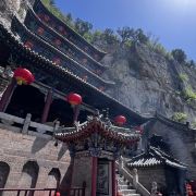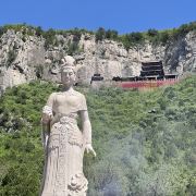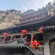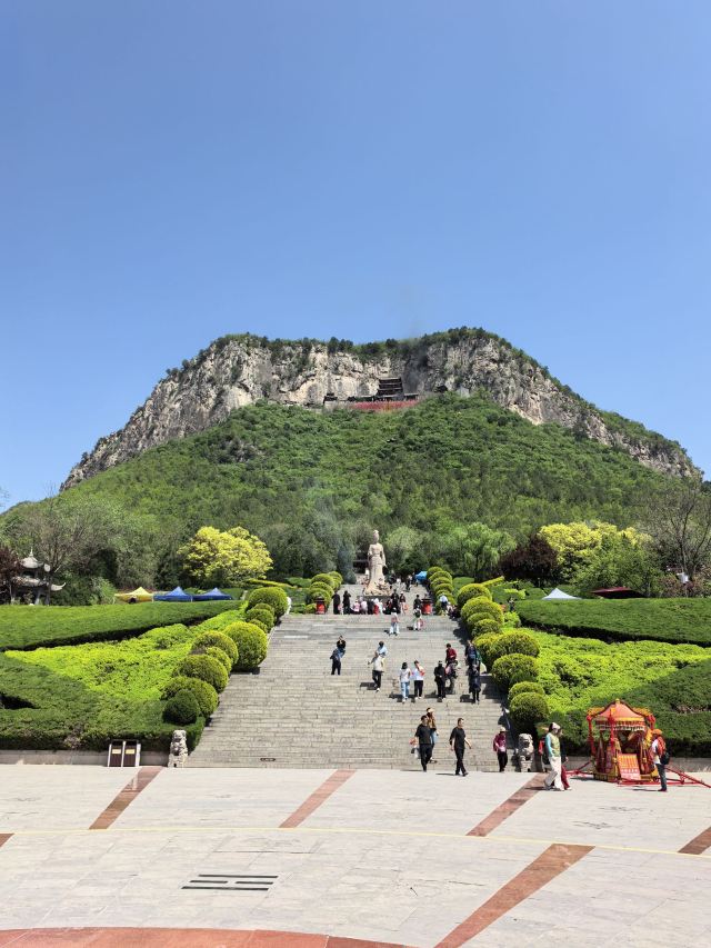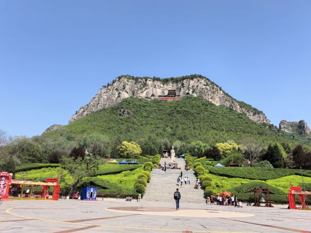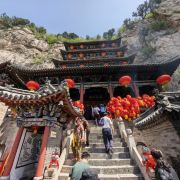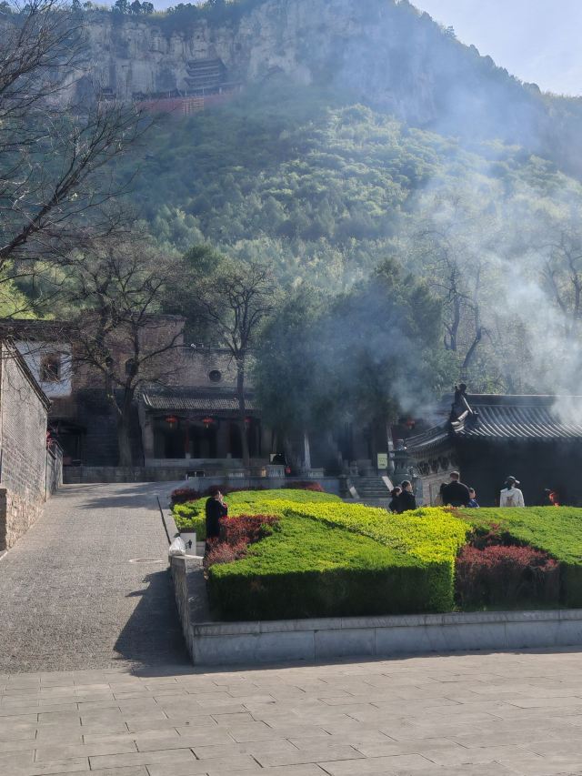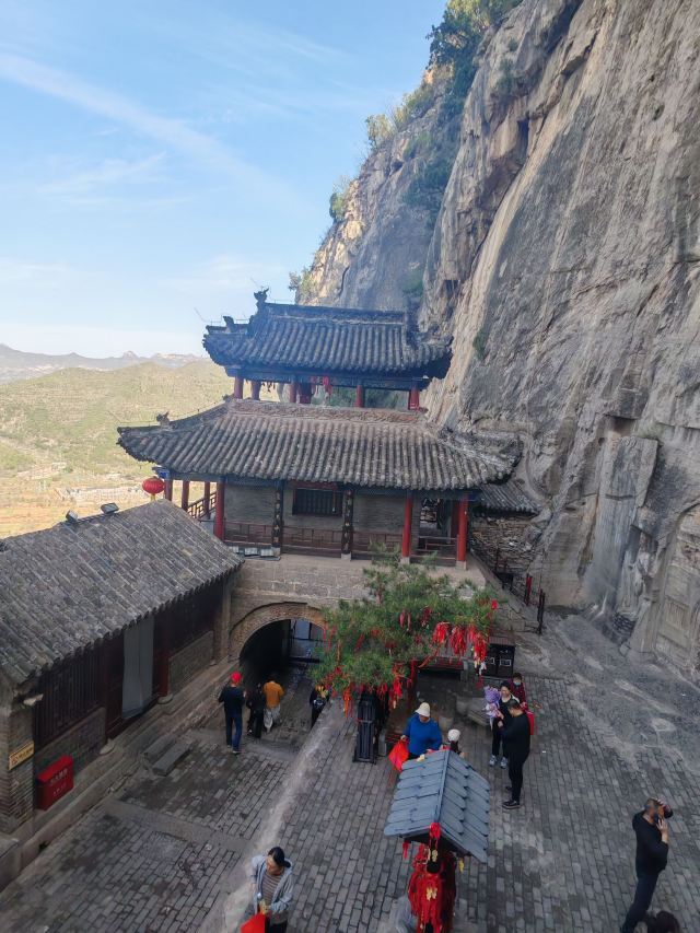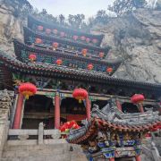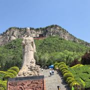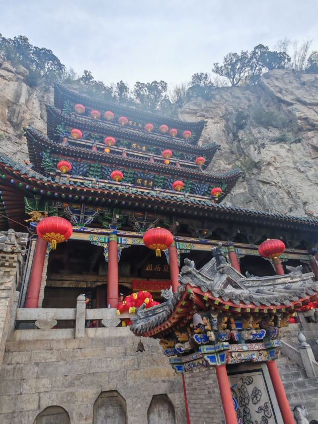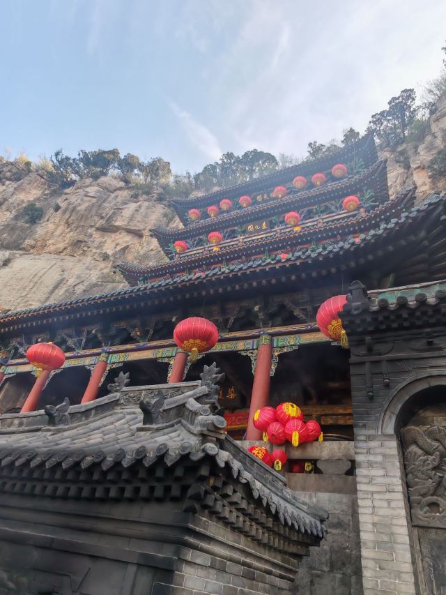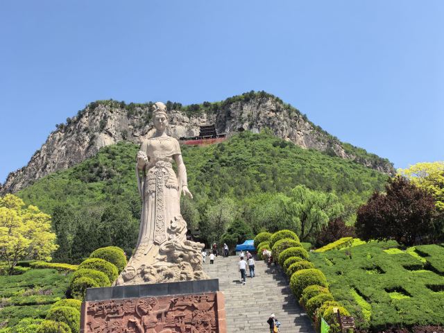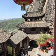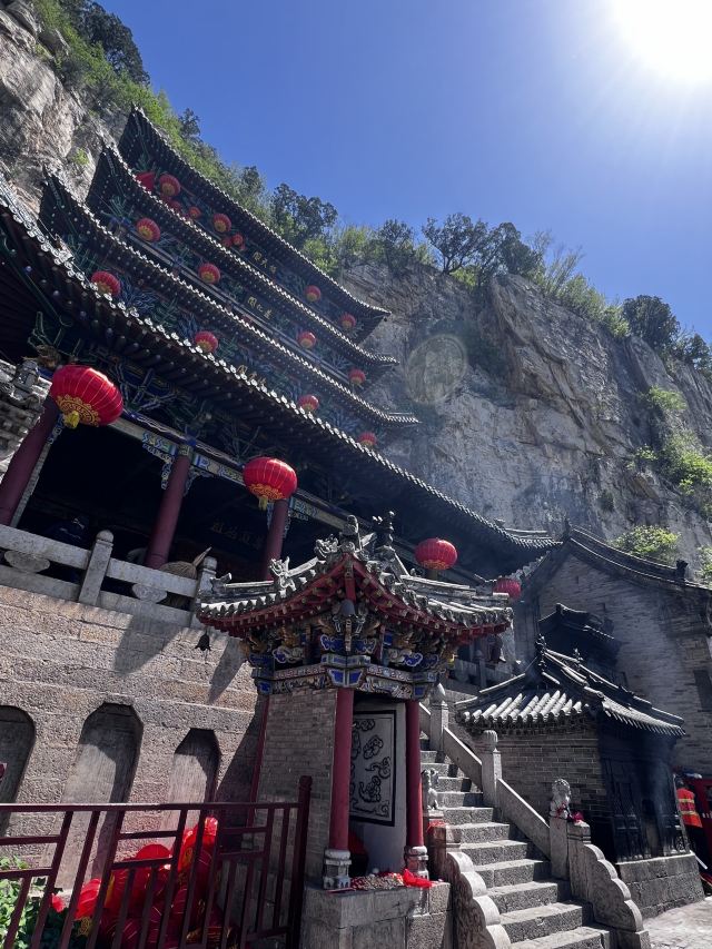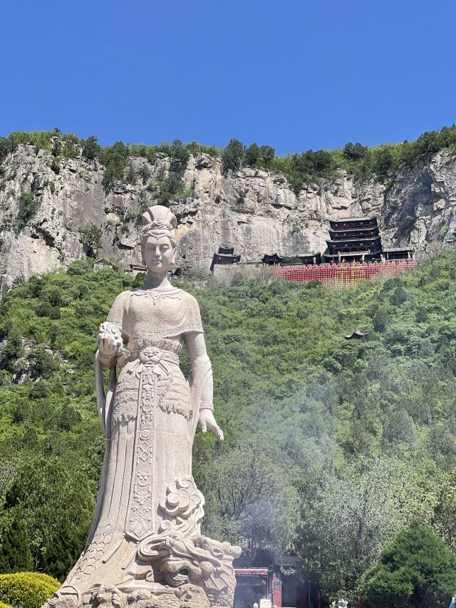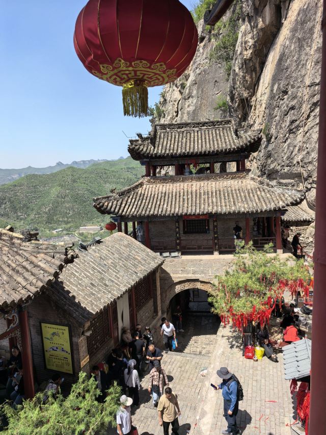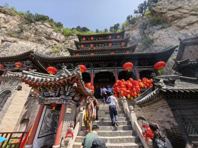沿着石质的台阶上山,山间有一些亭子和牌坊等,多为古迹,可以参观一下。在山腰处便是悬空而建的娲皇宫的主殿,里面供奉了女娲娘娘和很多道教的神像。旁边的殿堂里还有北齐时期的石窟、石刻经文的遗迹,是珍贵的古迹,非常值得参观。另外,山腰区域的视野非常开阔,在此可以俯瞰周围的景色,让人心意舒畅。
