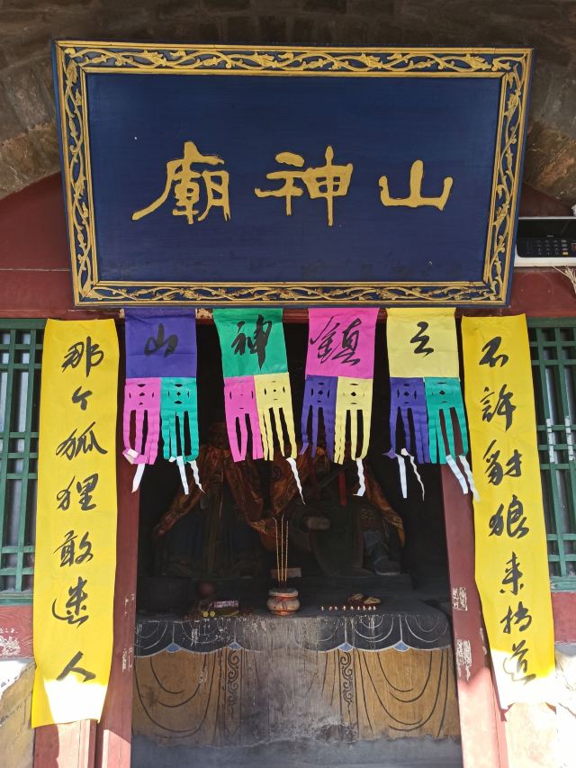 建造在自然山石平台上的圣母殿,始建于清代,殿前的石牌楼是明崇祯元年(1628年)所建,檐下石雕斗拱,额枋浮雕二龙戏珠,正面额题:“壁霞行宫”,北刻“圣母元君”。殿后是明代建筑二郎山风景区-诸神殿。