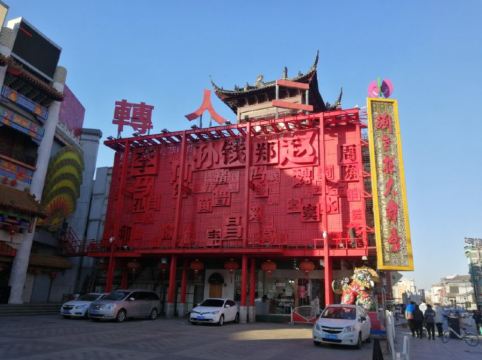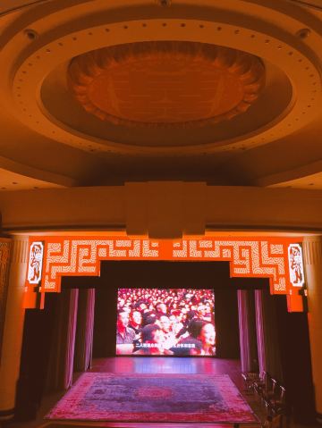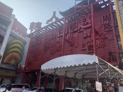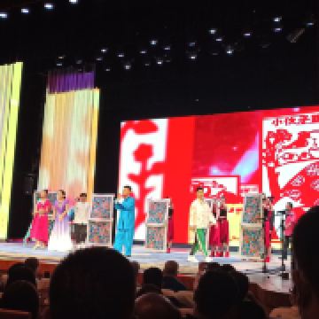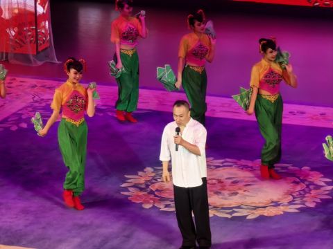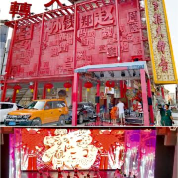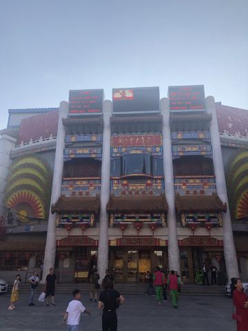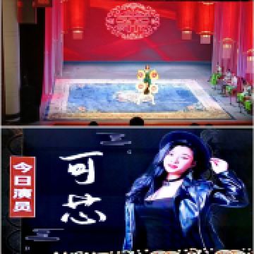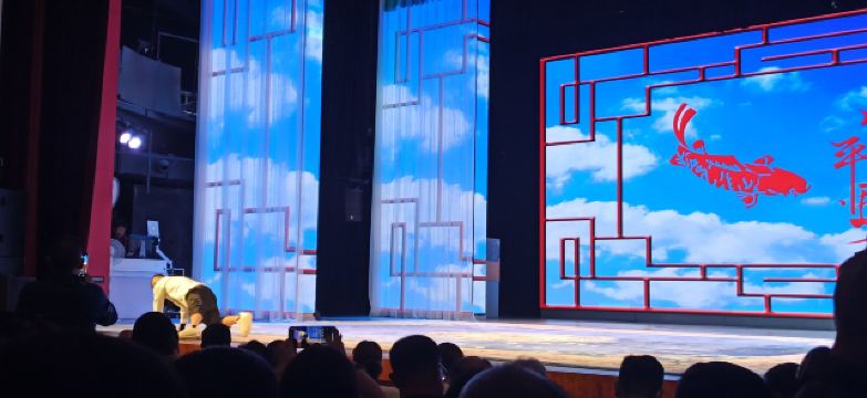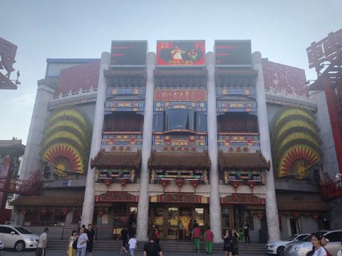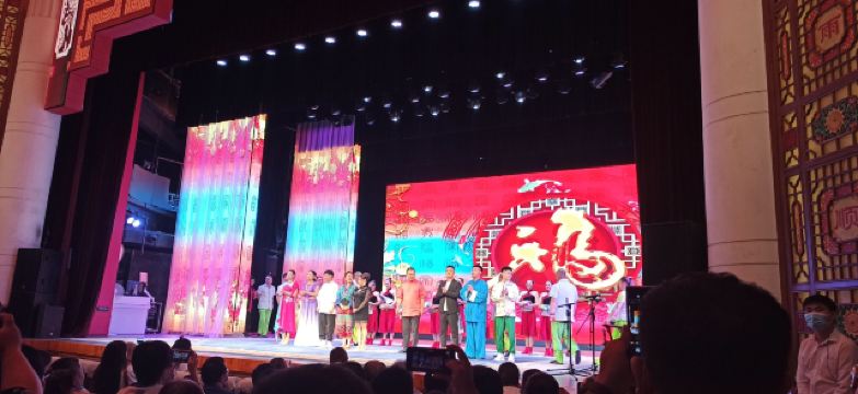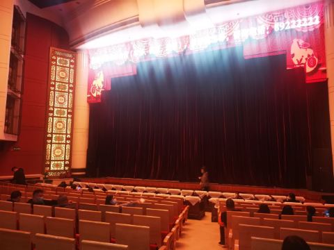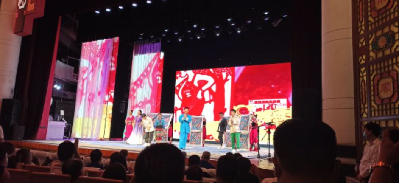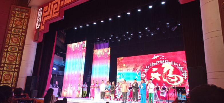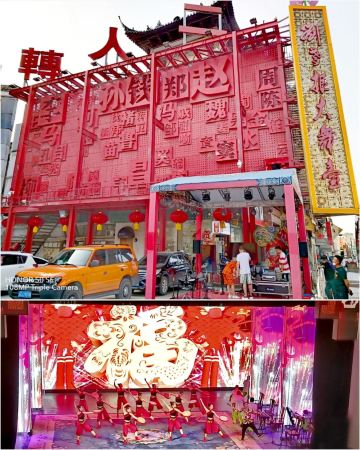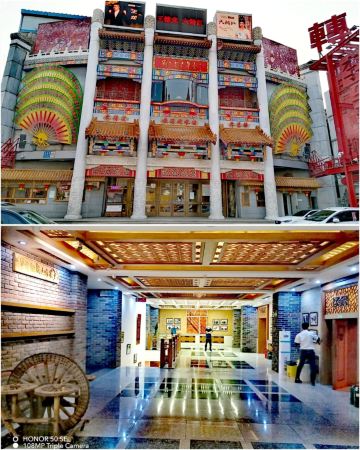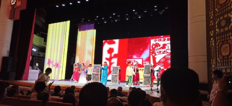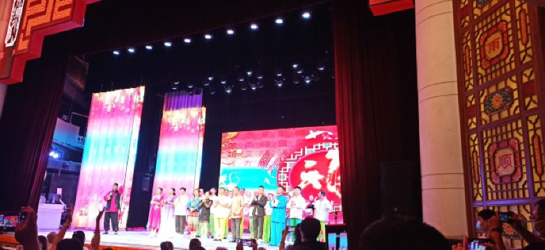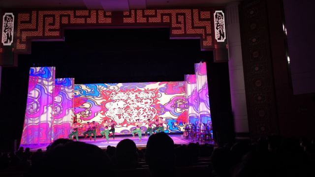 3、外观是一栋很有民俗风情的建筑,形似古代大戏楼,呈“凹”字形,突出的两侧分别是十二生肖剪纸图案和百家姓浮雕,艺术气息浓厚,是拍照点。演出开始前,门外就已经人声鼎沸,有做直播PK歌喉的场子,吸引了众多市民驻足看热闹,但直至我要进场了他们还没调试好音响。马路边停靠着印有“赵本山传媒”的红色大巴,让我热血沸腾。