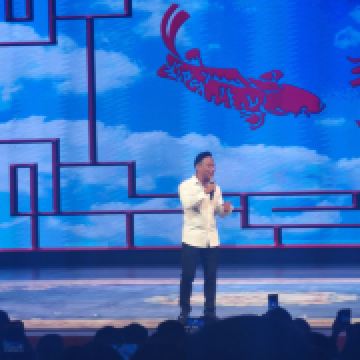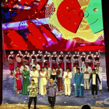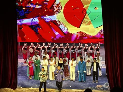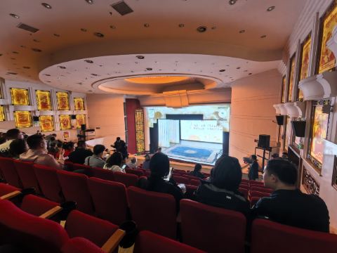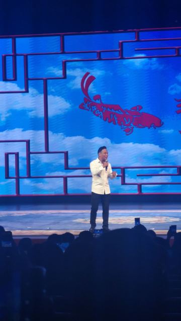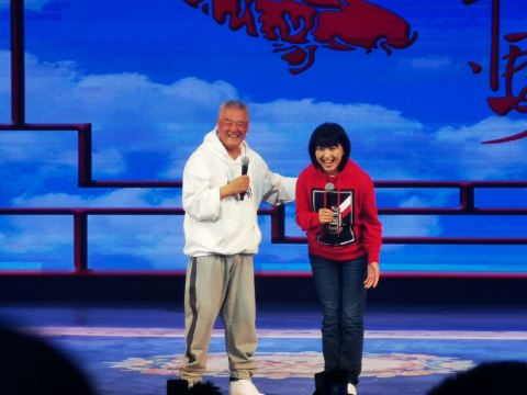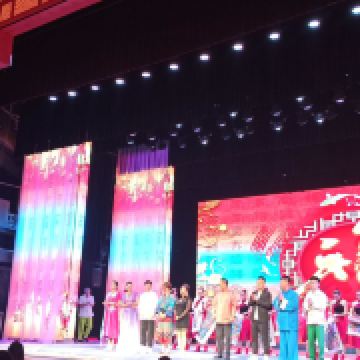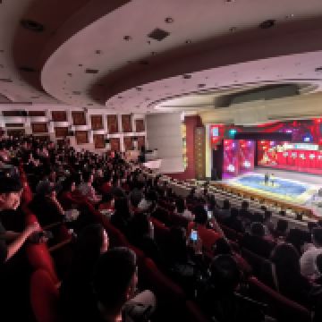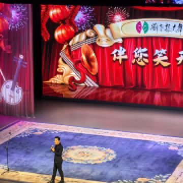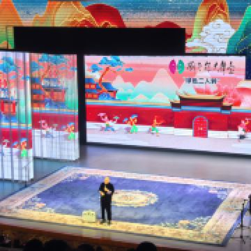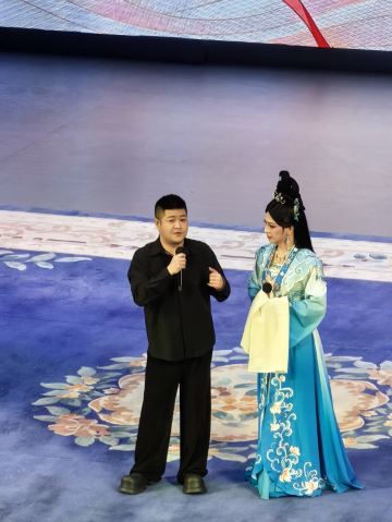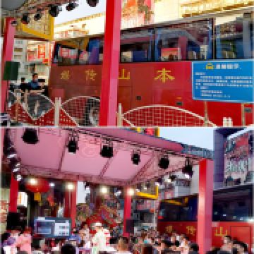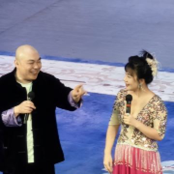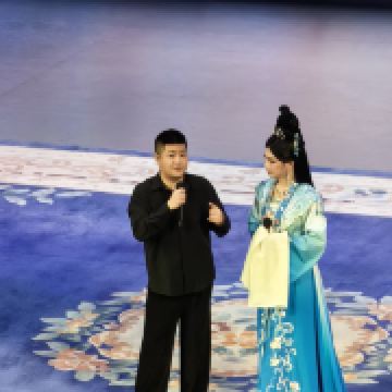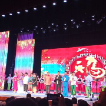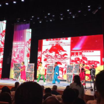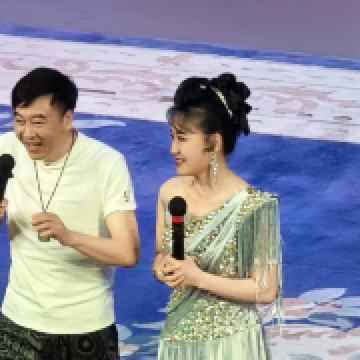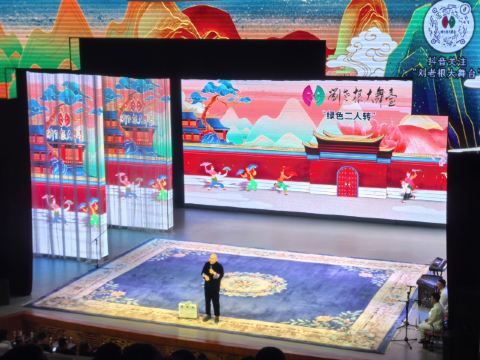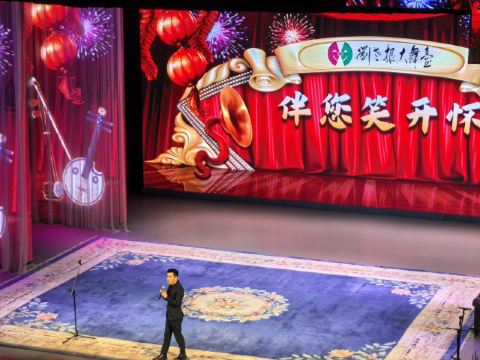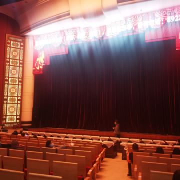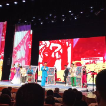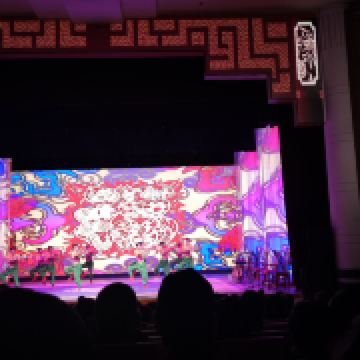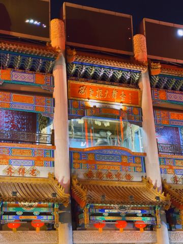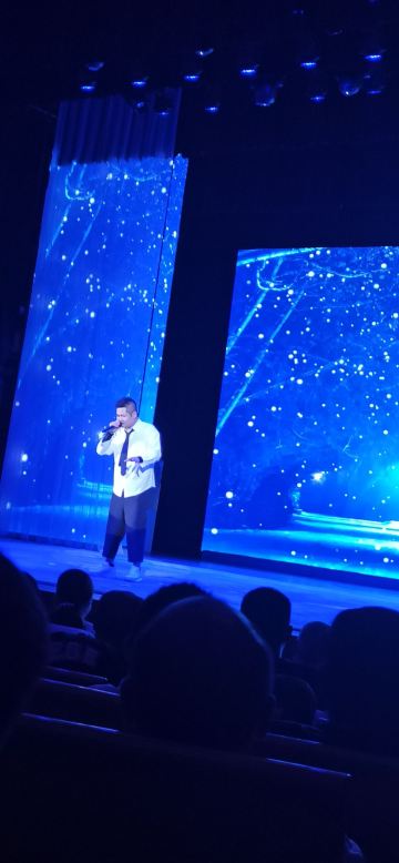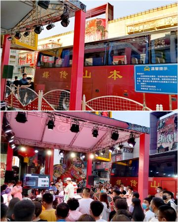 3、外观是一栋很有民俗风情的建筑,形似古代大戏楼,呈“凹”字形,突出的两侧分别是十二生肖剪纸图案和百家姓浮雕,艺术气息浓厚,是拍照点。演出开始前,门外就已经人声鼎沸,有做直播PK歌喉的场子,吸引了众多市民驻足看热闹,但直至我要进场了他们还没调试好音响。马路边停靠着印有“赵本山传媒”的红色大巴,让我热血沸腾。