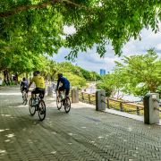 从地铁9号线深圳湾公园站D2口出来就是海,直奔观鸟平台,成群的海鸥贴着海面飞,抬手喂面包还能和海鸥近距离互动,这画面真的太治愈了!沿着滨海步道慢慢走,一侧是波光粼粼的深圳湾,隔海能望见香港的景致,另一侧是绿意盎然的椰林草坪,风吹过来全是清新的海味。骑共享单车环岛超舒服,单人车20元一小时,车道规划得很清晰,一路路过婚庆广场的白色礼堂、日出剧场的开阔沙滩,还有标志性的春笋大厦和春茧体育馆,随手拍都是城市海景大片,走累了沿途有长椅和观景台,随时能坐下来吹海风歇脚。