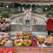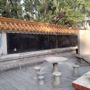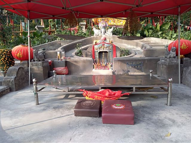碑后为坟堆,有两重弧形围墙,前段中间顶面塑祥云拱月,涂染朱红,后段顶面塑双龙拱日,下有一只凤鸟装饰。