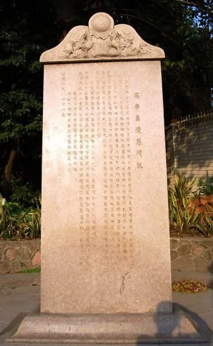 墓的东侧,立有一块泉州白石碑,正面是《宋帝昺陵墓碑记》,记叙了宋少帝的生平、陆秀夫负帝殉海的经过以及陵墓的修建情况,碑文为篆体阴文,风格古拙,是书法家商承祚所写。石碑背面则刻有书法家秦萼生题笔的八个大字:“崖海潜龙,赤湾延帝”,字体苍劲。