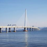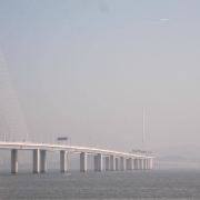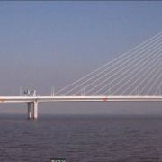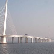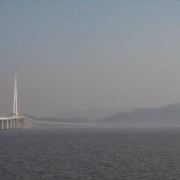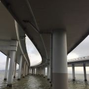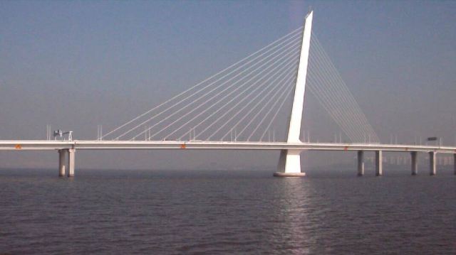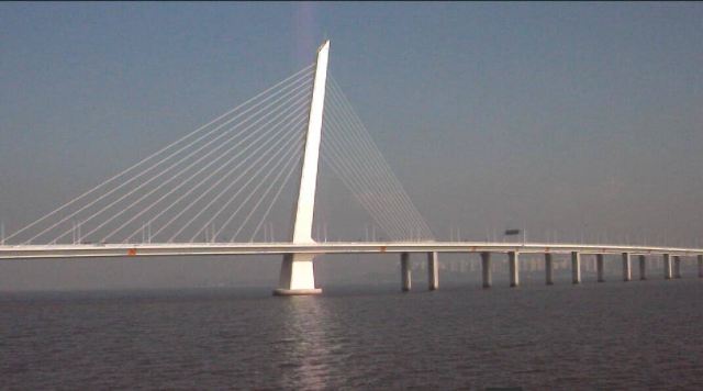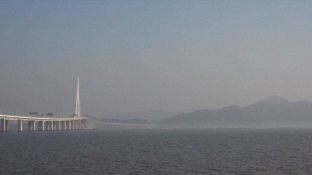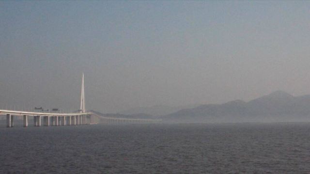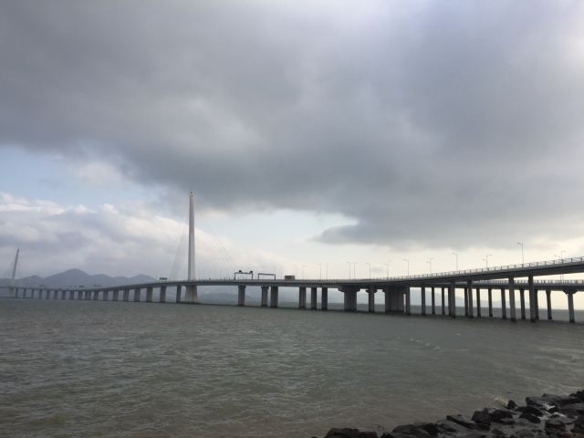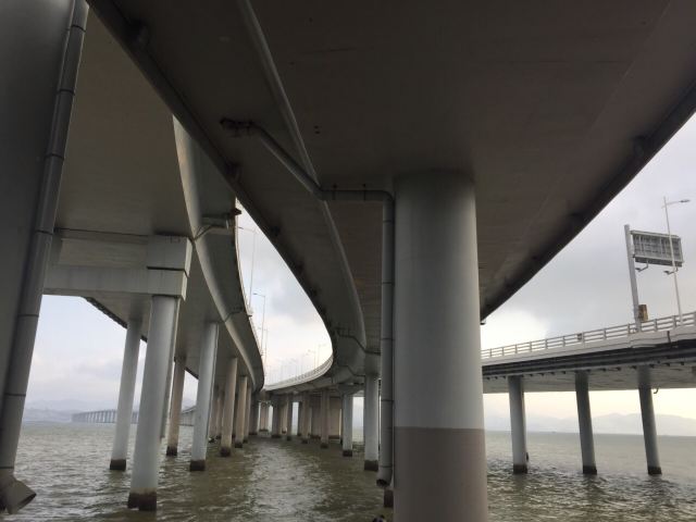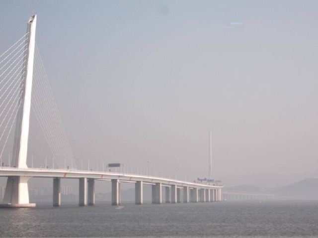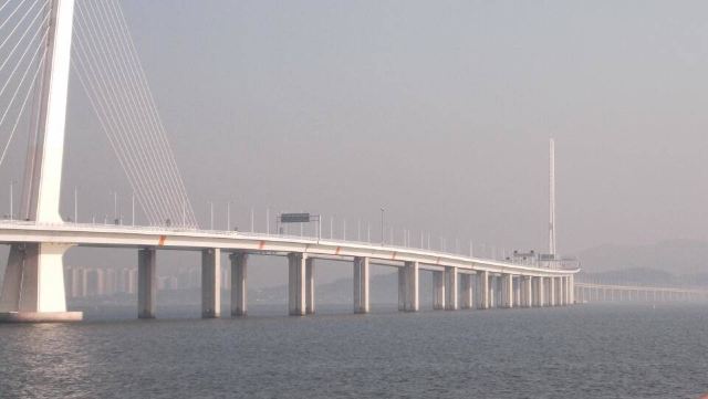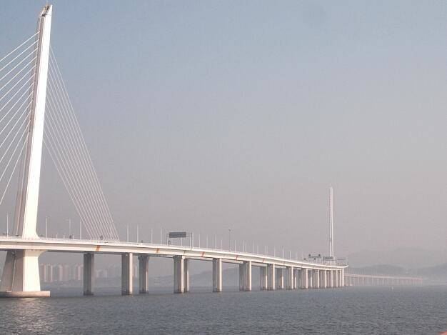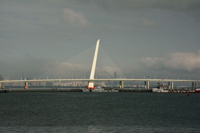 若从高处鸟瞰,只见略显S形的大桥蜿蜒跨过海面,如同一条巨龙跨越天海相接。通道的走线有少许弯度,设计上不仅可让司机沿途欣赏斜拉桥的美态,还有助于大桥本身和司机行车的安全。