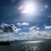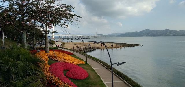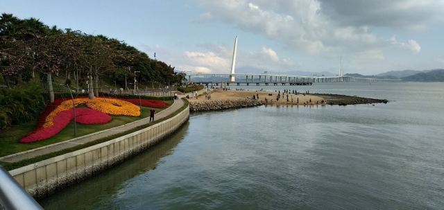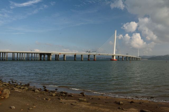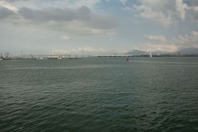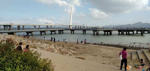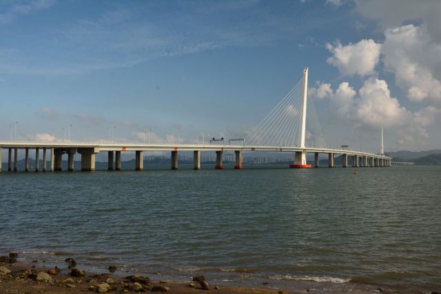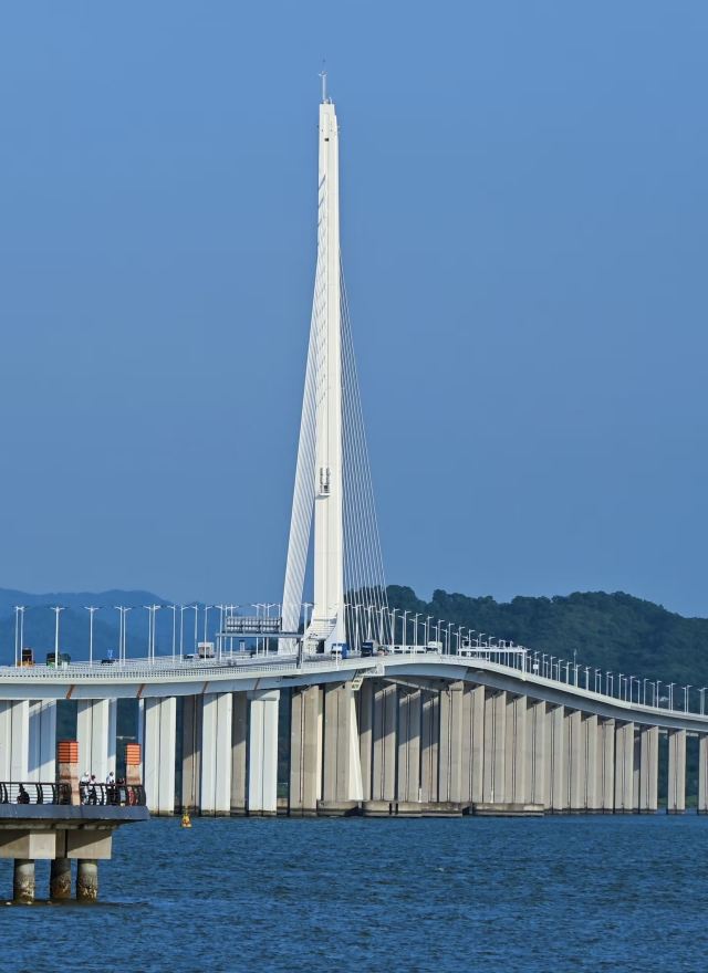 站在深圳一侧隔海望去,一座银色通道蜿蜒逶迤飞架海上,阳光下耸立的斜拉桥熠熠生辉,象征着深港两地的紧密握手。