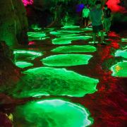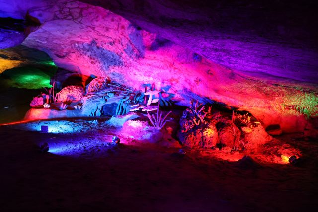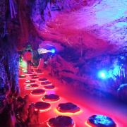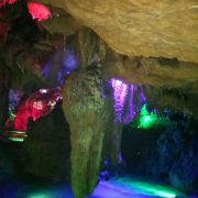 穹顶洞壁的钟乳石投影水面,与水中晶莹玲珑的奇石浑然一体,在彩色灯光的照耀下,愈显绚丽多姿,使人恍若步入龙宫仙境。泛舟进洞四百米许,舍舟登岸,但见钟乳石千奇百怪,倒悬洞顶,石笋石柱错落:“朝龙殿”、“瑶池”、“灵芝宝菌”、“龙王宝座”等五十多处景观,今人目不暇接。更兼头顶滴水如琴,脚下清泉如瑟,冬暖夏凉,使人游兴愈浓,流连忘返。龙王洞在石门县城西北28公里处,正在1829省道干线边。距龙王洞8公里有热水溪温泉疗养中心。从龙王洞往西北5公里进入张家界市境内,可不经慈利县城,去索溪峪80公里。