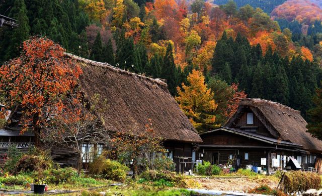 这里的高海拔在冬季迎来很大的降雪量,是日本著名的雪乡。这里的山居很有特色,呈60度角的人字形茅草覆盖木屋顶,可以让雨雪滑落,不渗水,不积雪。这种特殊的屋顶就是著名的“合掌造”,110 多栋连成一片,1995 年被联合国教科文组织列为世界文化遗产。