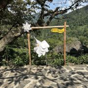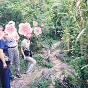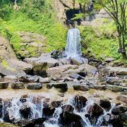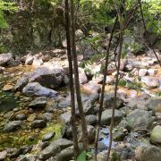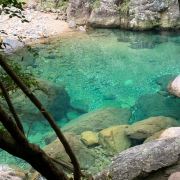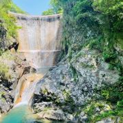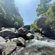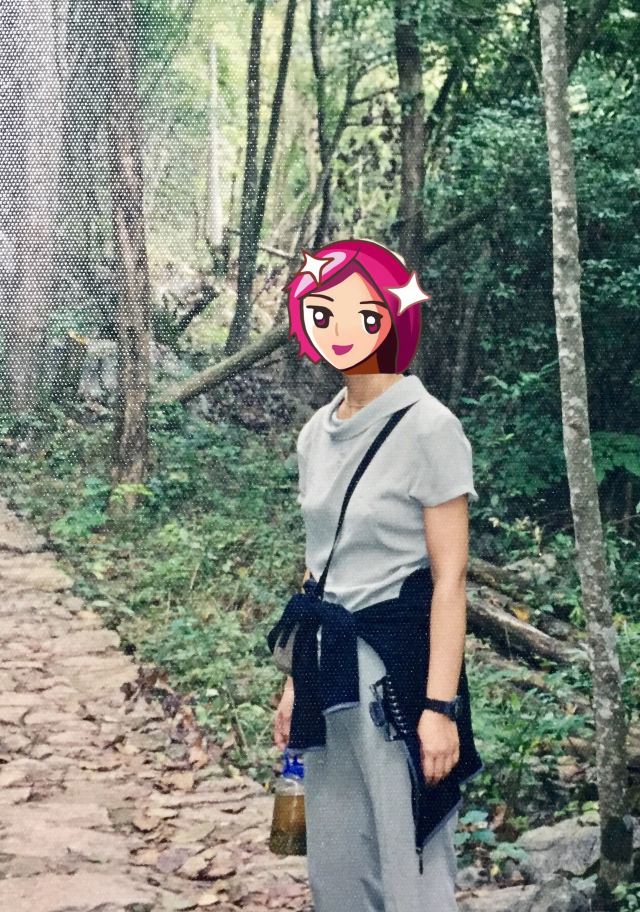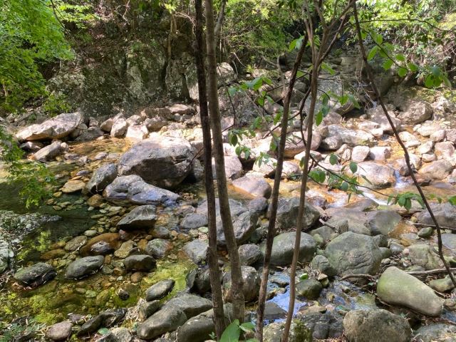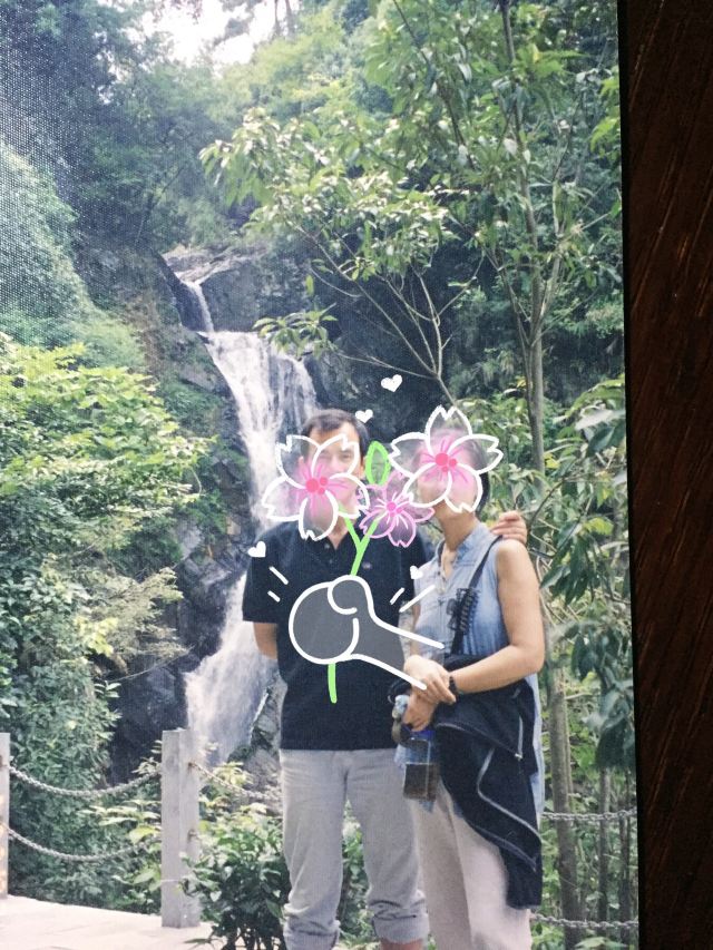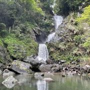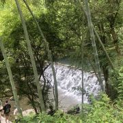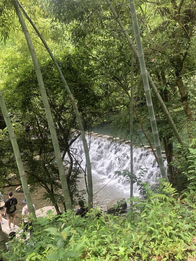瀑布处有一段类似石头步道的小道,连接龙门潭的另外一头,可以走到中间,欣赏龙门潭的全景,在龙门潭的岸边有几棵大树,阳光透过树叶缝隙散射到地面和水中,那状态美极了,让同行几位男人也学起女人在树下潭边摆起姿势拍起了照片。