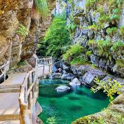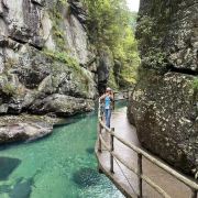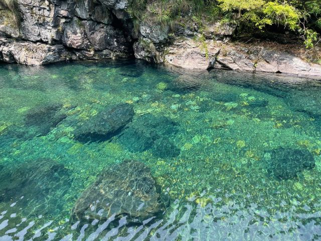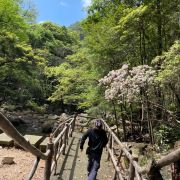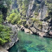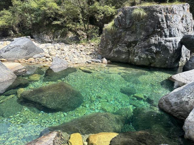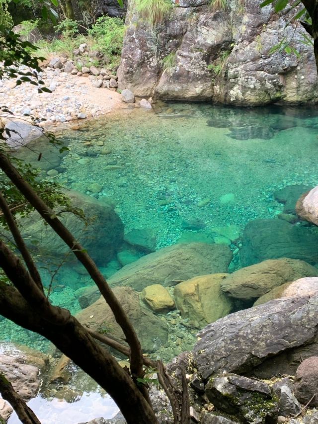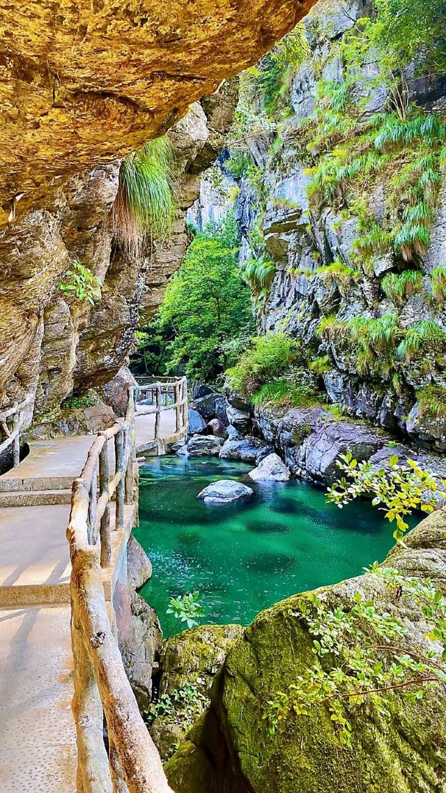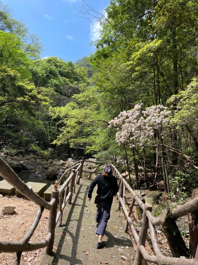 美景之地自然是停留了好一会,听路过导游说前方还有一个木制吊桥,在桥上可以俯瞰下方的石滩和碧绿的潭水,迫不及待加快步伐,几分钟的路程就到了吊桥处。