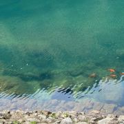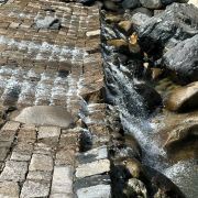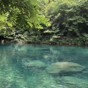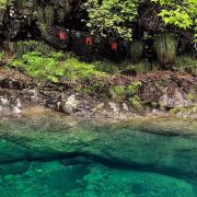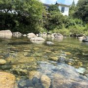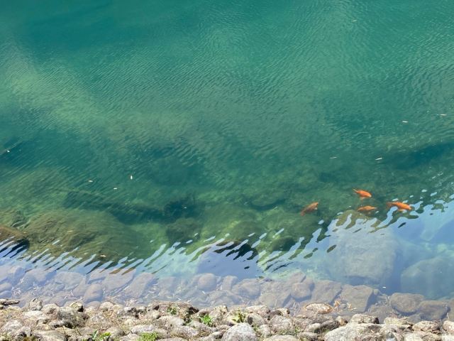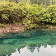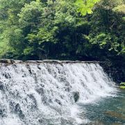走进一小会就看见远处的堤坡瀑布,瀑布下方的石滩在水流长期流淌中变得圆润光滑。走到瀑布处,上游就是龙门潭,发现水是如此的碧绿,但是不是那种水污染的绿色,这种绿是清澈见底,水底的石头和是水草还有水中游走的鱼儿看的是一清二楚,能和九寨沟的水相媲美了,甚至更有特色,如果不是事先知道这里,过来还以为是来到九寨沟了呢。