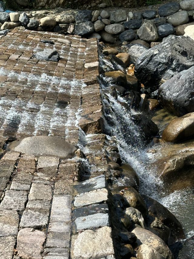转过听涛亭,忽有轰鸣声破雾而来。严家古村的石桥下,翡翠涧正奔涌着融化的雪水。当地人把这里唤作"龙门潭",两壁赭色崖石被经年流水凿出龙鳞纹路,春阳斜照时,整条涧流仿佛被揉碎了满河星光。我蹲在圆石上掬水,指尖触到的是冰镇青梅酒般的清冽。