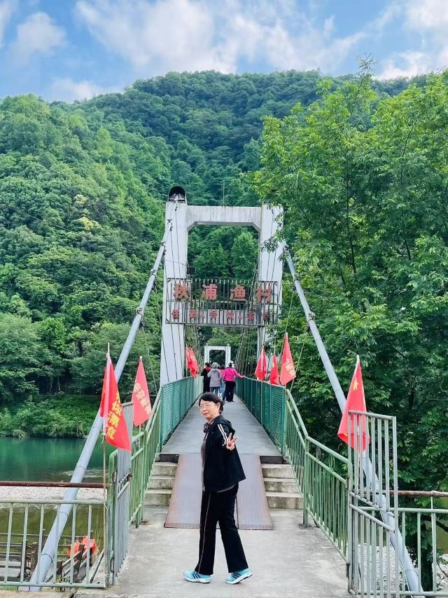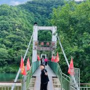 连接两个小亭子,这个亭子叫驻马亭,下方是石滩和深谭,吊桥不长,估摸不到100米的距离,看过去有种网上的网红吊桥的感觉,在两旁青山的照映下,吊桥显得很是文艺和美丽,吸引不少人的合影留恋。