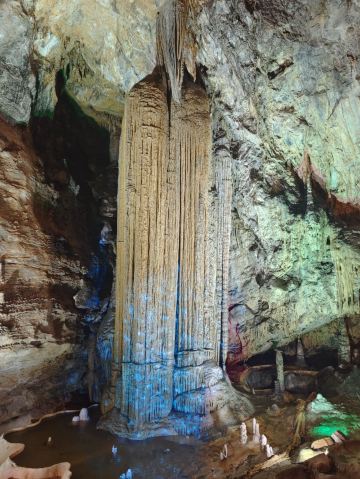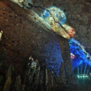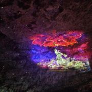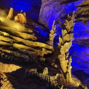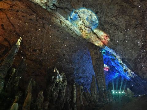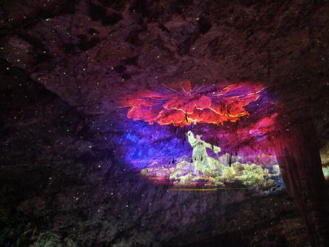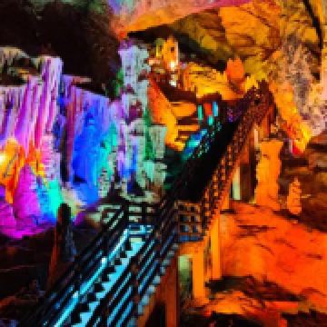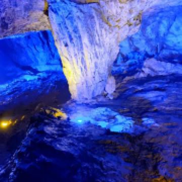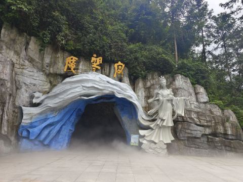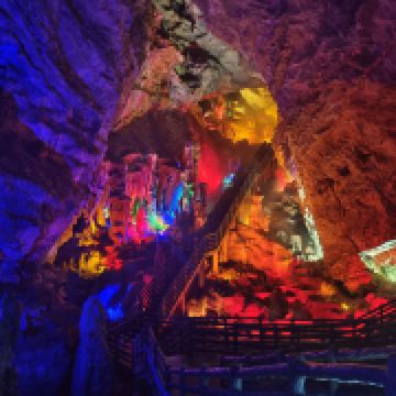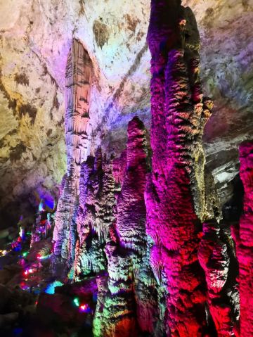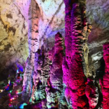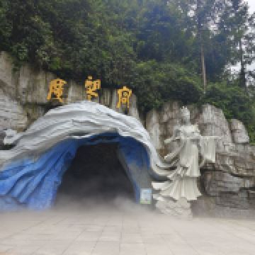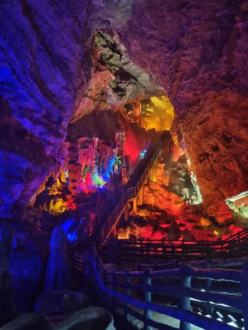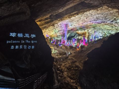 5分 超棒农家乐住了一晚徒步上山,老公说可以中和一下溶洞里面的寒气,广寒宫门口就弥漫着阵阵寒雾,一靠近就觉得凉爽无比。进入洞口,瞬间冷气扑面而来,光线骤暗,顺着石阶向下曲折进入,扶手因为常年低温,摸上去都冰凉湿润,各色石笋、石花、石柱在灯光的探射中闪烁着迷人的姿态,投影在石潭中的神话传说极具3D效果,宛如盛开的莲池,映射出前世今生,久久挪不开步。广寒宫的“琼楼玉宇”整个空间高度超过50米!洞穴顶空的石壁上点点星光闪耀流动,悠扬的仙乐缓缓飘来,投影的画面渐渐清晰,仙娥的簇拥下,嫦娥仙子翩翩起舞,月桂树琉璃浮动、无字天书神秘璀璨、陨石坑星罗棋布,浮光跃金、掠影沉璧,让人遐想联翩、叹为观止!越往纵深,洞内温度越低,越往出口,石梯越高,最后乘坐缆车下山,意犹未尽地结束了广寒宫的星空溶洞之旅。