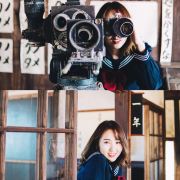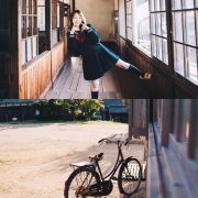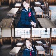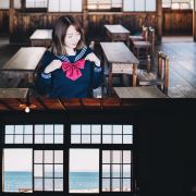 映画村可以租短款的和服,类似一休哥里面小女孩穿的那种朴素款。水手服是我自己带的,大约10年前买的麻友同款三本线,因为系不好领巾就换了蝴蝶结。上半身搭配古早的教室非常昭和风啦。