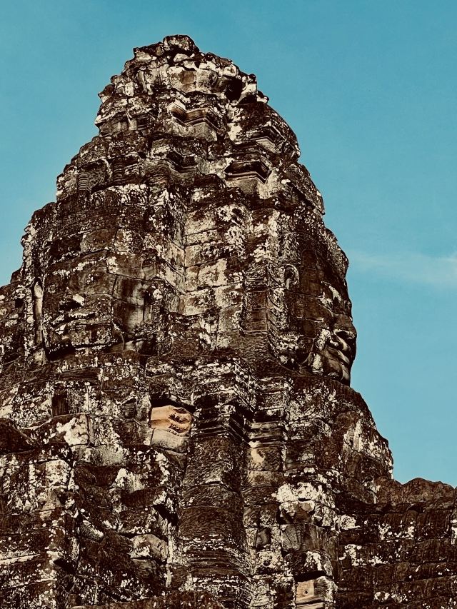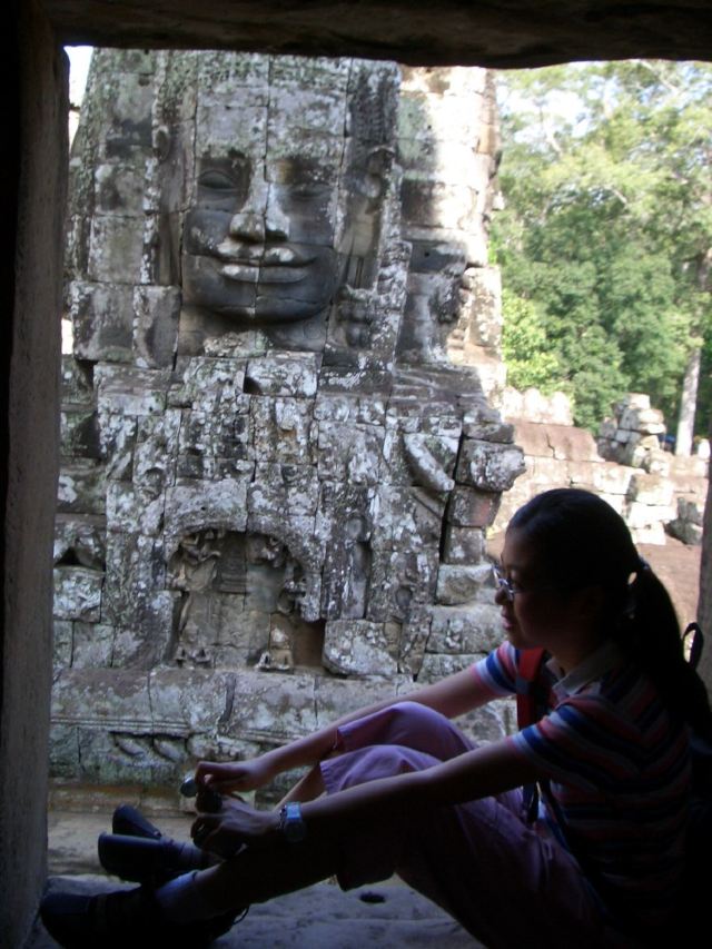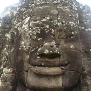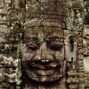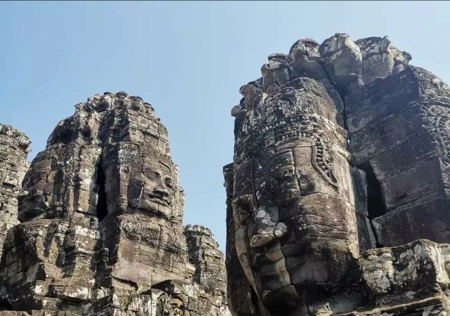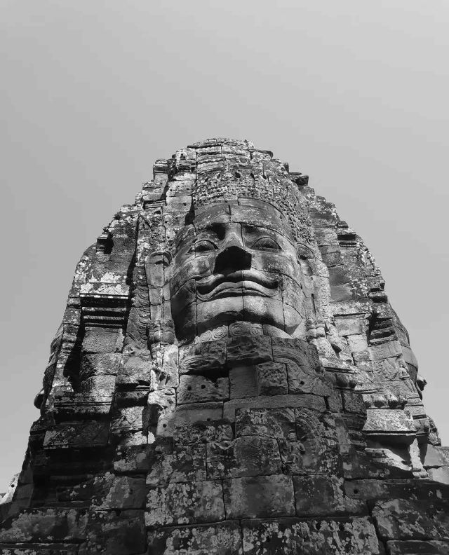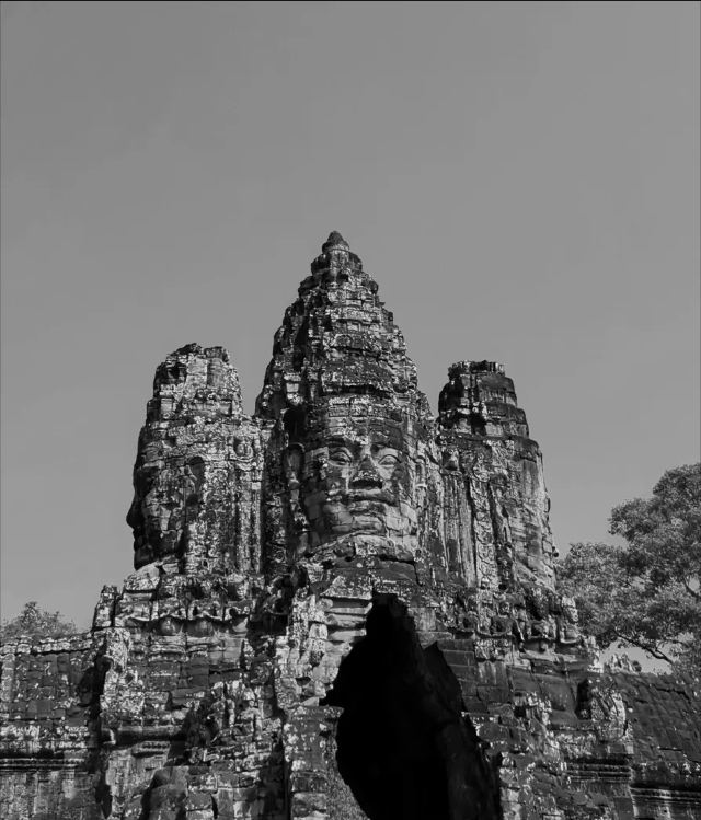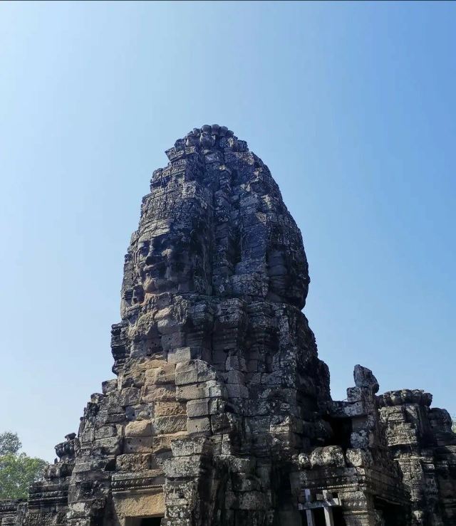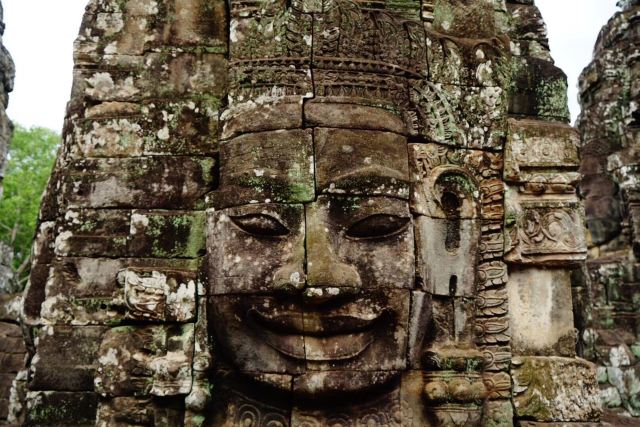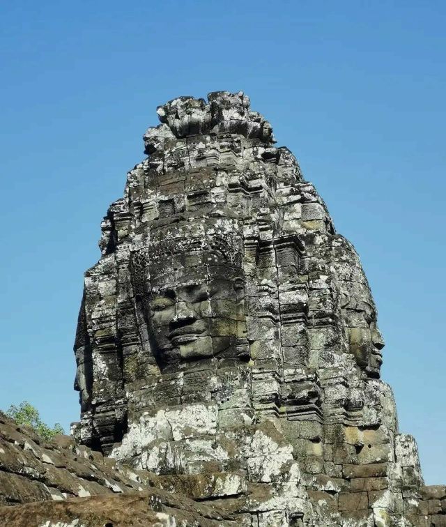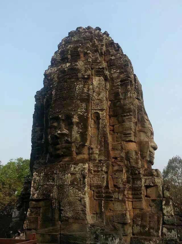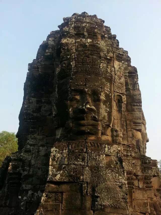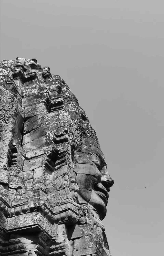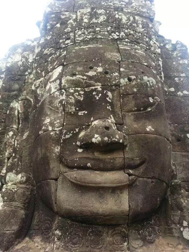 佛塔的顶部刻有巨大的四面佛,佛像的四面分别代表慈、悲、喜、舍,而且都带着安详的微笑。仔细观察,你会发现这些笑容有着细微的差别,微微上翘的嘴角说不出是宽容还是嘲讽的意味,仿佛藏着什么世人永远无法了解的秘密。而这便是令吴哥窟享誉世界的“高棉的微笑”。
