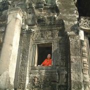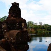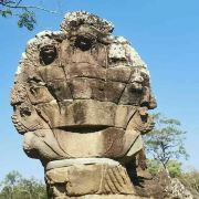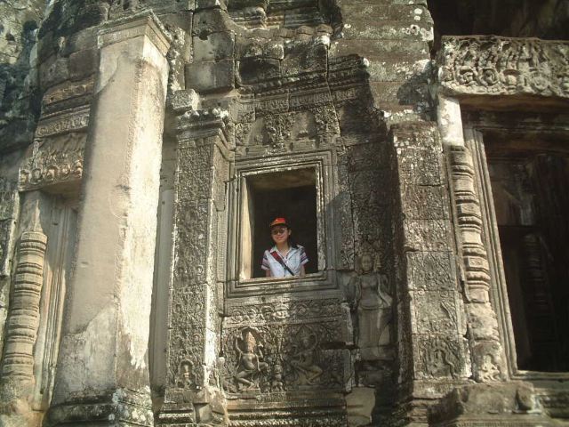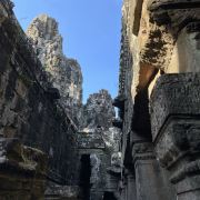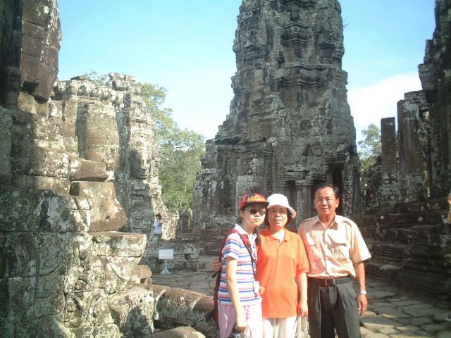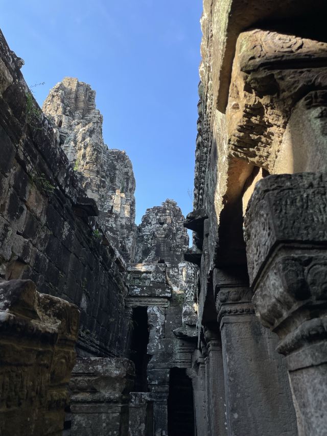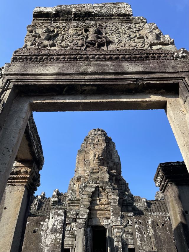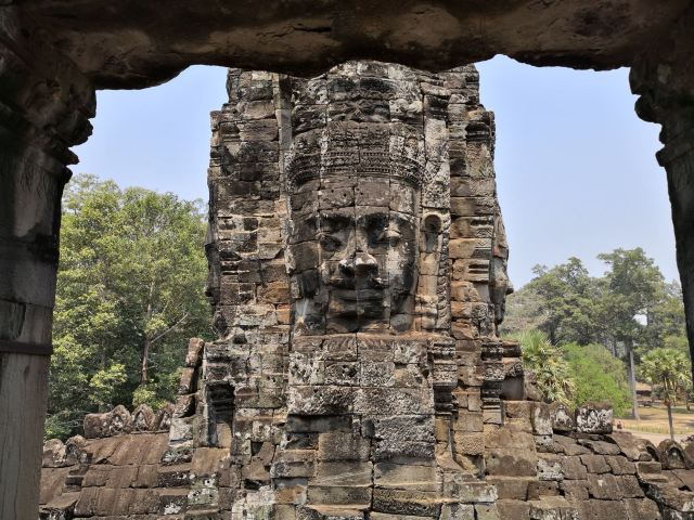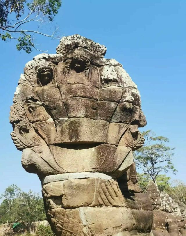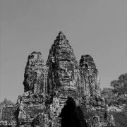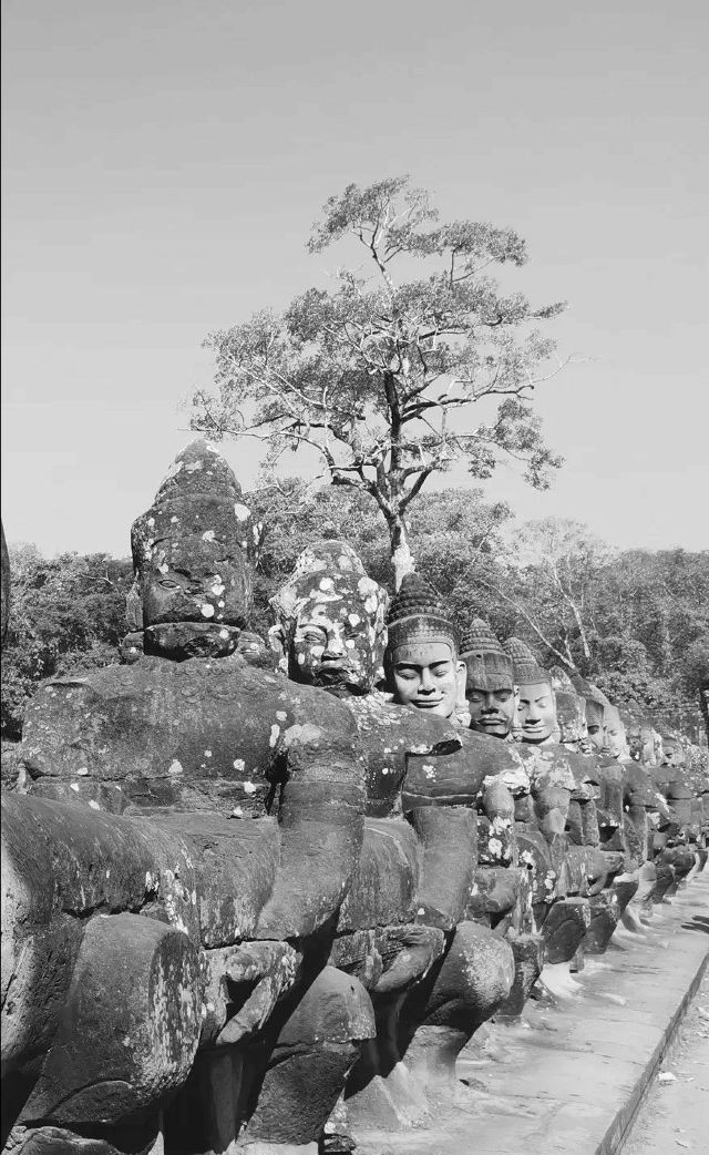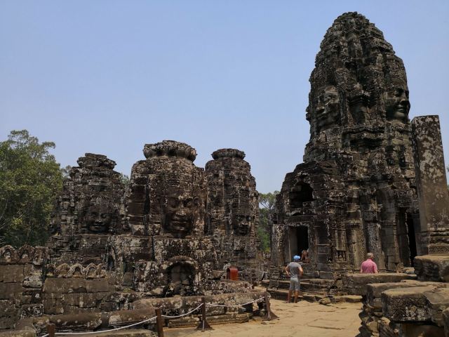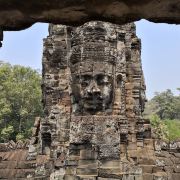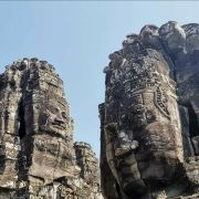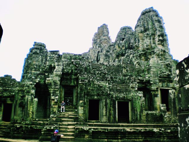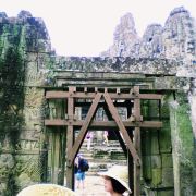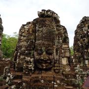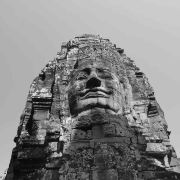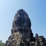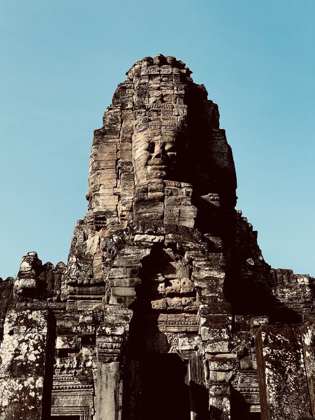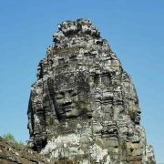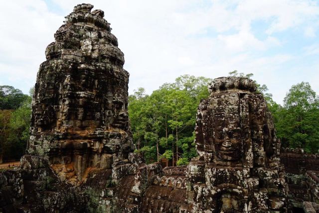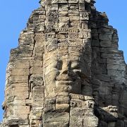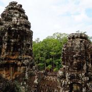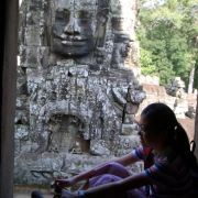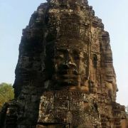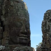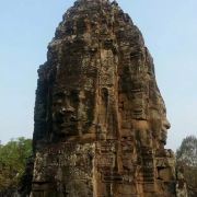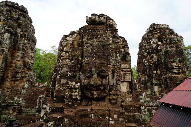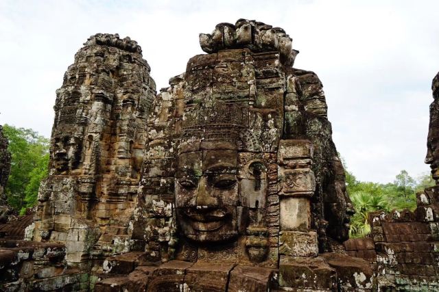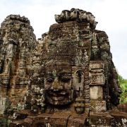 佛塔的顶部刻有巨大的四面佛,佛像的四面分别代表慈、悲、喜、舍,而且都带着安详的微笑。仔细观察,你会发现这些笑容有着细微的差别,微微上翘的嘴角说不出是宽容还是嘲讽的意味,仿佛藏着什么世人永远无法了解的秘密。而这便是令吴哥窟享誉世界的“高棉的微笑”。