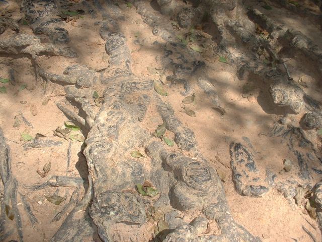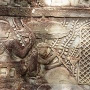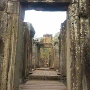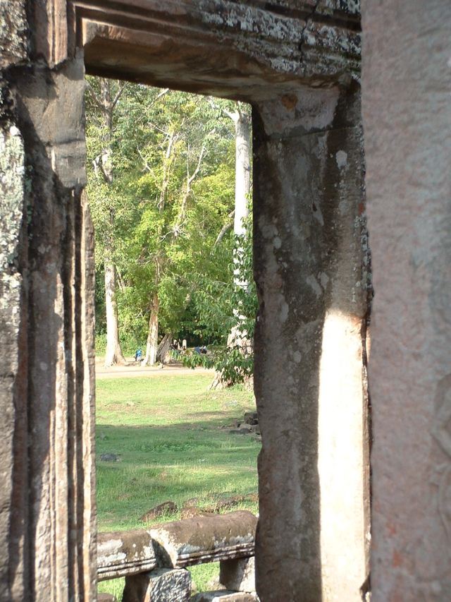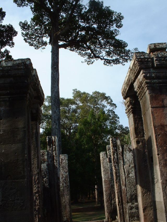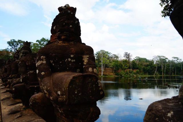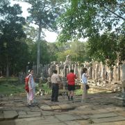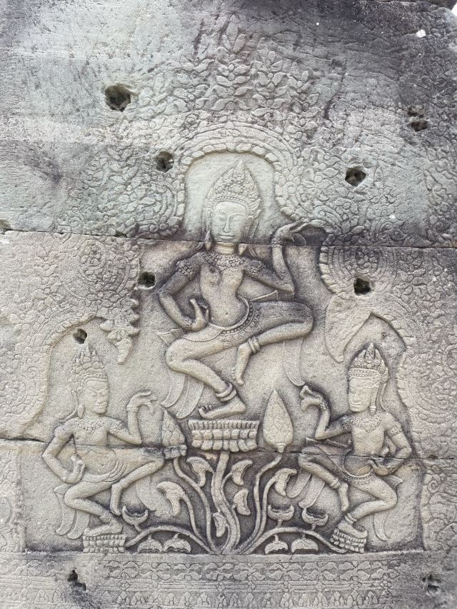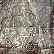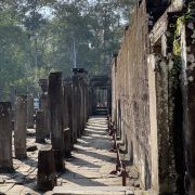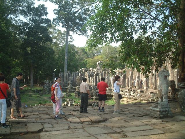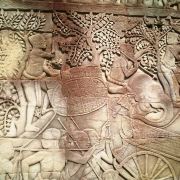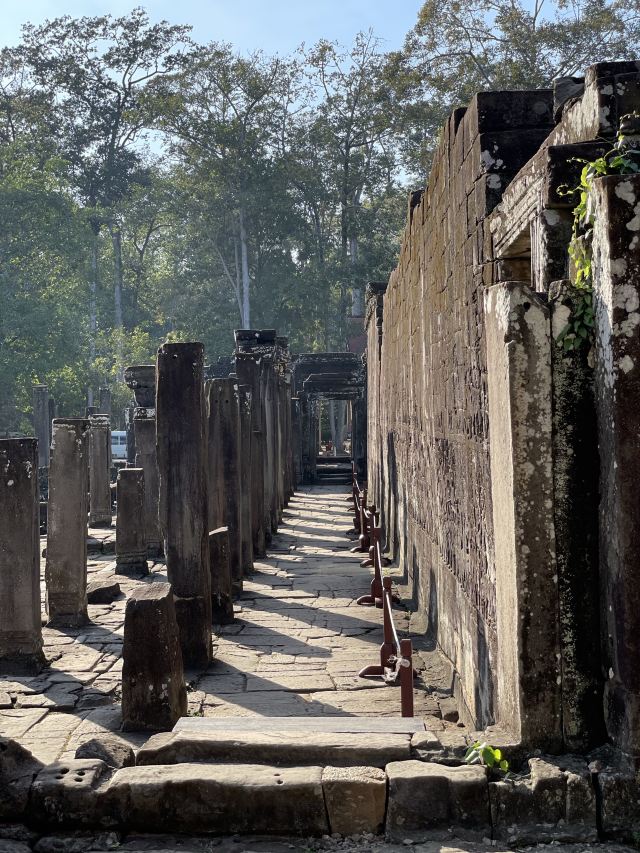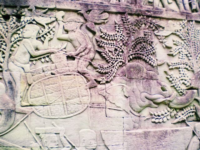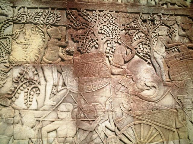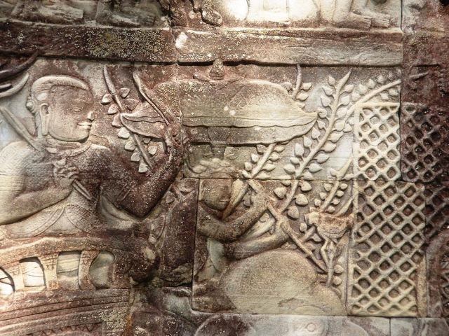 百米多宽的回廊上原本建有木造的屋顶,但现在只能看到断壁残垣和巨大的石柱。现存回廊的墙壁上可以看到十分丰富的浮雕,内层主要为神话和宗教故事,如搅拌乳海、毗湿奴神的形象等;外层则以现实生活为题材,从古代战争记述到寻常百姓生活百态、洞里萨湖风光等。这些活灵活现的浮雕似乎在诉说着一段段遥远的故事,是不可不看的珍贵史迹。