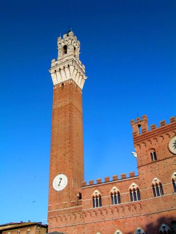 锡耶纳市政厅位于锡耶纳中心的贝壳广场上,始建于1297年,是一座受哥特式影响的中世纪建筑。建造市政厅起初的目的是为了容纳由长官和九人委员会组成的共和政府。这座建筑物下层是石造,上层是砖造,立面稍微弯曲,上面均匀分布着整齐的眼洞。市政厅的立面中部有两层哥特式的尖拱三孔窗户,二层两边和顶部都排列着伦巴第风格的盲拱。