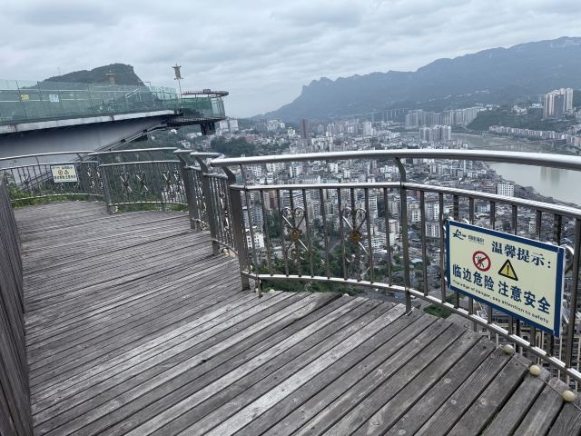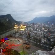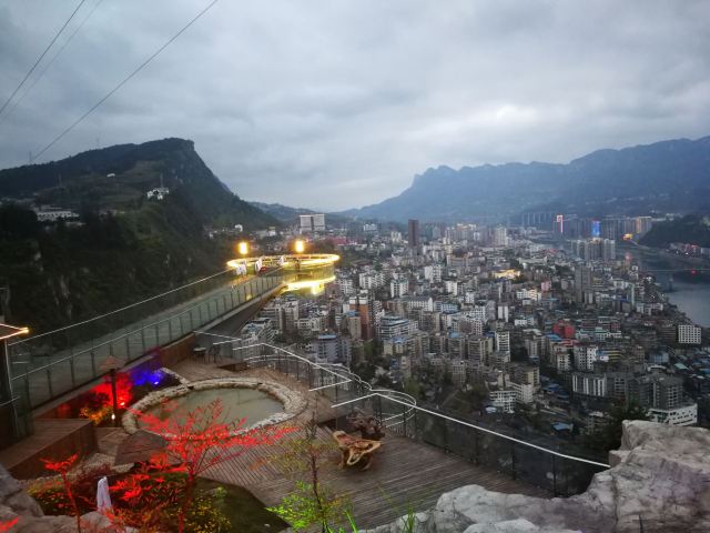 悬崖温泉建在乌江崖岸并紧临古城“城际线”的兽王山顶,距离奔腾乌江大约200米,比城市“中间线”高出180余米。