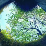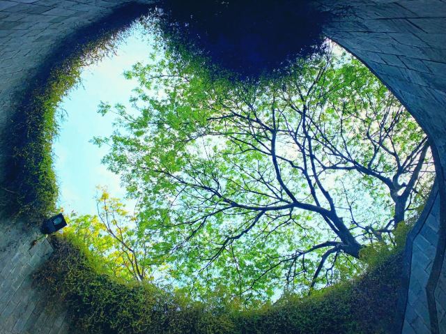 它的网红天井居然还有一个很炫的名字,叫“龙之穴旋转楼梯”,后者逼格一下子高了从天井井底往上看,茂密的大树要铺满天空,井边挂满绿色墙蔓,如同爱丽丝梦游仙境一般。