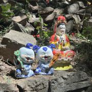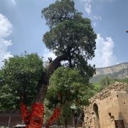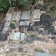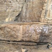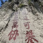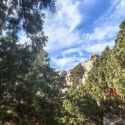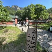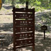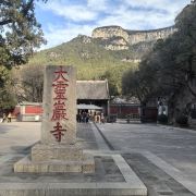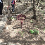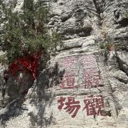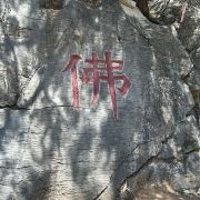 暂别甘露泉继续向山上走去。这里的路标很有特色,不用木牌,而用荧光色的笔在山石上写着,并附上箭头,非常醒目。之后便来到了白云观,据说这里是观音成仙的地方。此处有一个天然的山洞,山洞的尽头供奉着两尊观音像。出来继续登上山顶,这里便是红门。红门是建在山顶的一座小庙,庙里供着一尊大石佛。站在红门外远眺,东边的云雾中就是泰山的极顶。参观完后可原路返回。