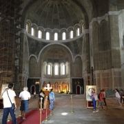 教堂建筑风格独特,融合了拜占庭式与塞尔维亚传统风格。教堂主体呈白色,外观宏伟庄严,穹顶高耸,标志性的绿色穹顶在阳光下闪耀着独特光芒,与周围建筑形成鲜明对比。教堂内部空间宽敞,装饰精美,壁画、雕塑等宗教艺术品随处可见。
