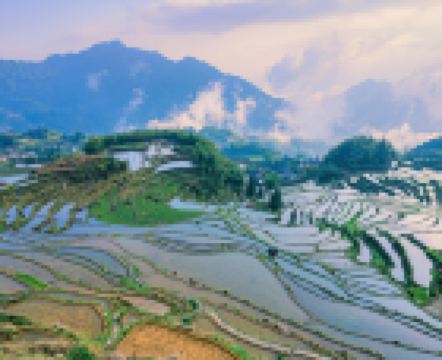 - 山水环绕:村落周围对面山、屏风山、祖坟山、大山脚、上山头五座大山合拢,左右两翼山峦环抱,村前是层层梯田,潺潺小溪自东而西环绕村落,构成了一幅宁静而美丽的山水田园画卷。