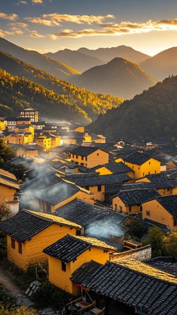 错落层叠的黄泥古屋:200多年历史的夯土建筑群,夕阳下泛着金棕色光泽,航拍视角神似微型布达拉宫。