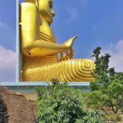 来到丹布勒石窟寺山下,会看到一座有现代风格的狮子口造型的建筑,屋顶上是巨大的金佛像,因此当地人也把这里叫做金寺。这是座精美而俗气的建筑,是2000年由日本捐助建成的,佛像摆着dhammachakka mudra(转轮)的姿势,边上还有一个巨大的霓虹灯标志。